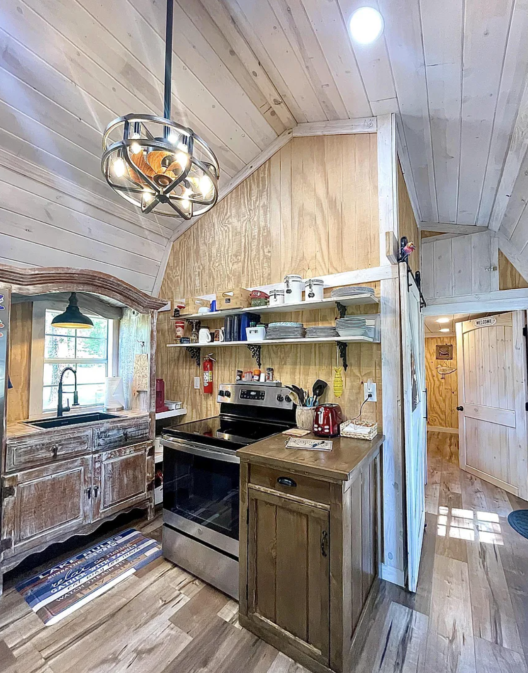 The cabin with its open floor design seems to be way bigger than its small area. A comfortable queen bed serves as the main sleeping area on the first floor, while there is enough space for additional air mattresses or sleeping bags in the loft which can easily accommodate up to eight people as a cabin.