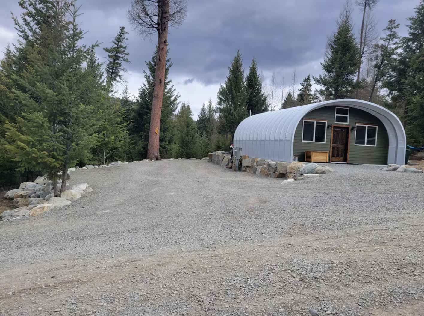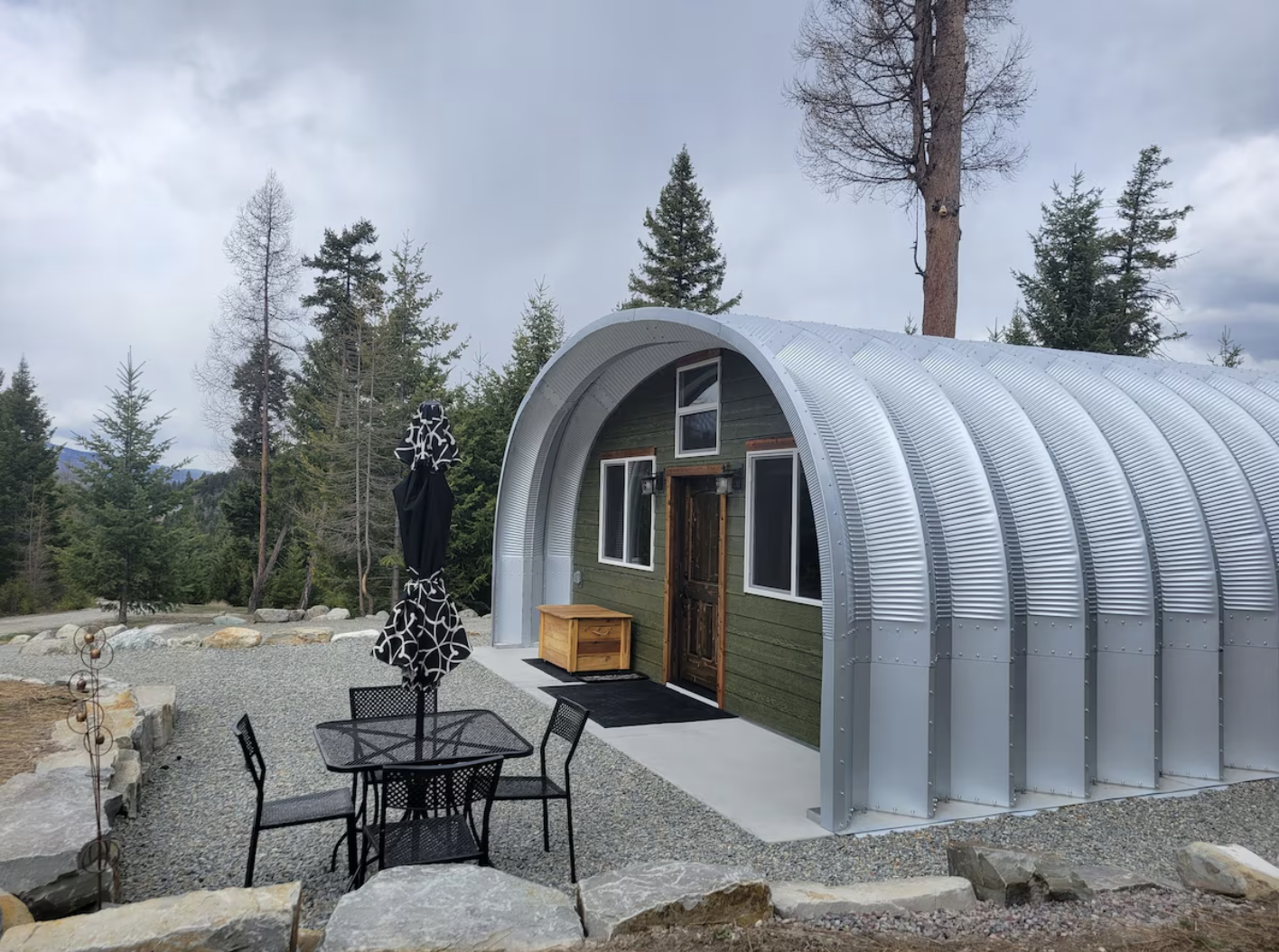 The luxurious Quonset hut vacation rental in Kila, Montana, is an industrial charm and modern comfort beautifully fused, where the curved 750 square feet steel structure turns into a quiet serene woodland escape with stunning mountain views. This 1-bedroom 1-bathroom retreat is perfect for 4 guests and provides a full kitchen, air conditioning, and a barbecue grill—all surrounded by the forest’s peacefulness near Glacier Park.