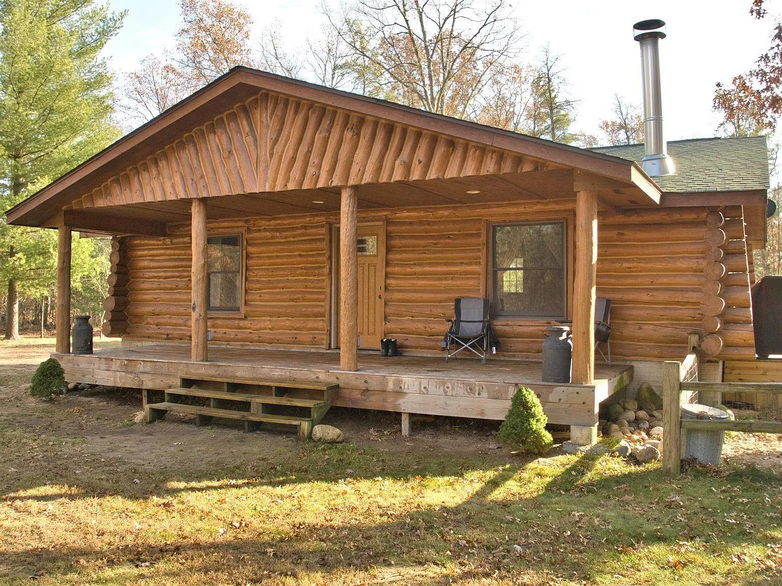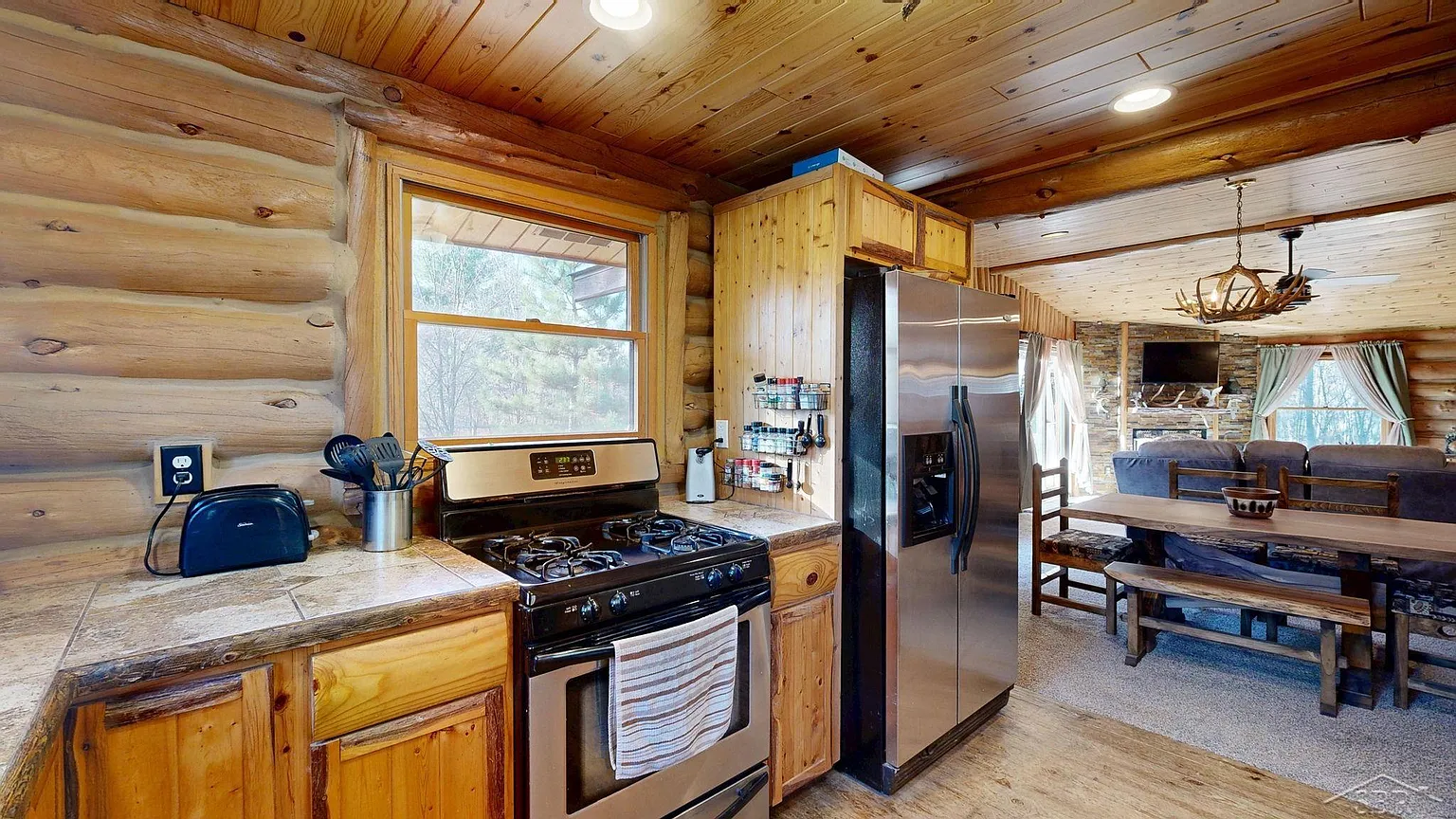 The cabin is really an entertainer’s dream to be outside. Several deck areas extend from the main living area, thus, the indoor and outdoor spaces blend together and offer the perfect place for summer barbecues, fall fires, or quiet winter evenings during which you can watch the snow covering the forest. With the 8.02 acres, you have absolute privacy—no neighbors in sight, the wind in the trees, and the occasional hoot of a barred owl are the only sounds.