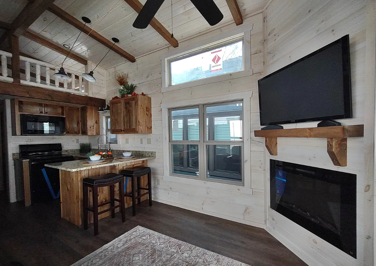 Inside, the Smoky 1227’s 397-square-foot layout is a beautiful testament to Tiny Life Homes’ commitment to efficient, high-end design, where the open floor plan maximizes space while incorporating premium upgrades that elevate everyday living. The living area flows seamlessly from the kitchen, with Whitewash walls that reflect light beautifully, creating a bright, airy feel that counters the cabin’s modest size.