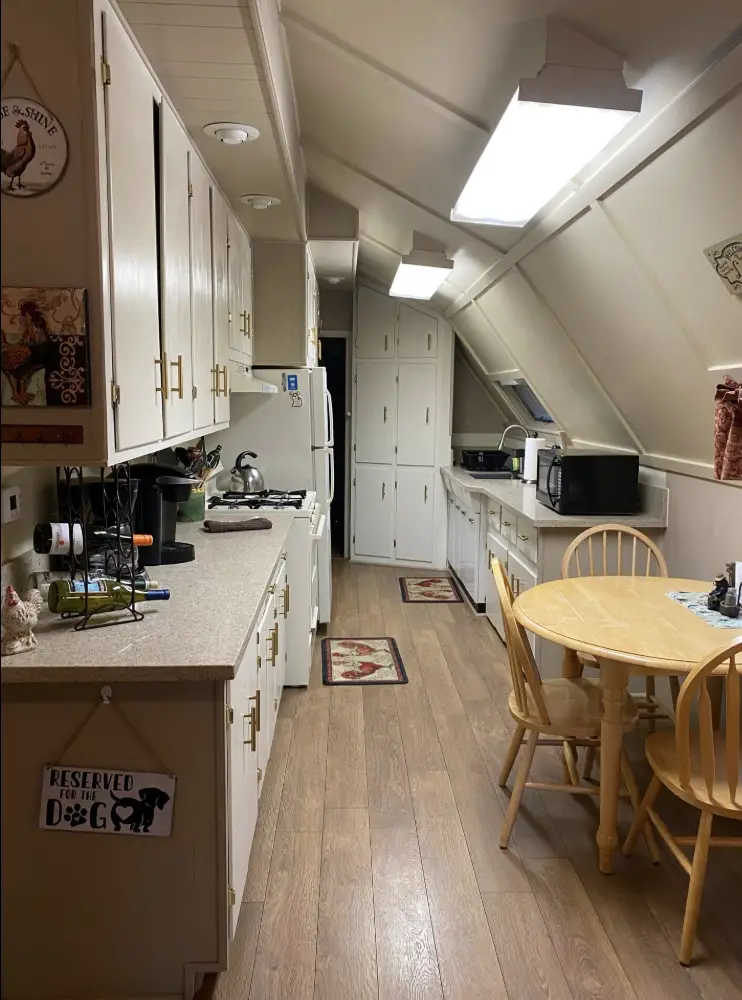 The cabin’s regulations-dogs allowed (with cleanup necessary), no smoking, quiet after 10 pm- make it a refuge for everyone, and the security cameras give safety without disturbance. This is a cabin where the Quonset’s industrial beauty meets the cabin’s cozy soul, a space that’s as beautiful for its uniqueness as it is for the memories it holds, from snowy mornings on the deck to summer nights by the stove.