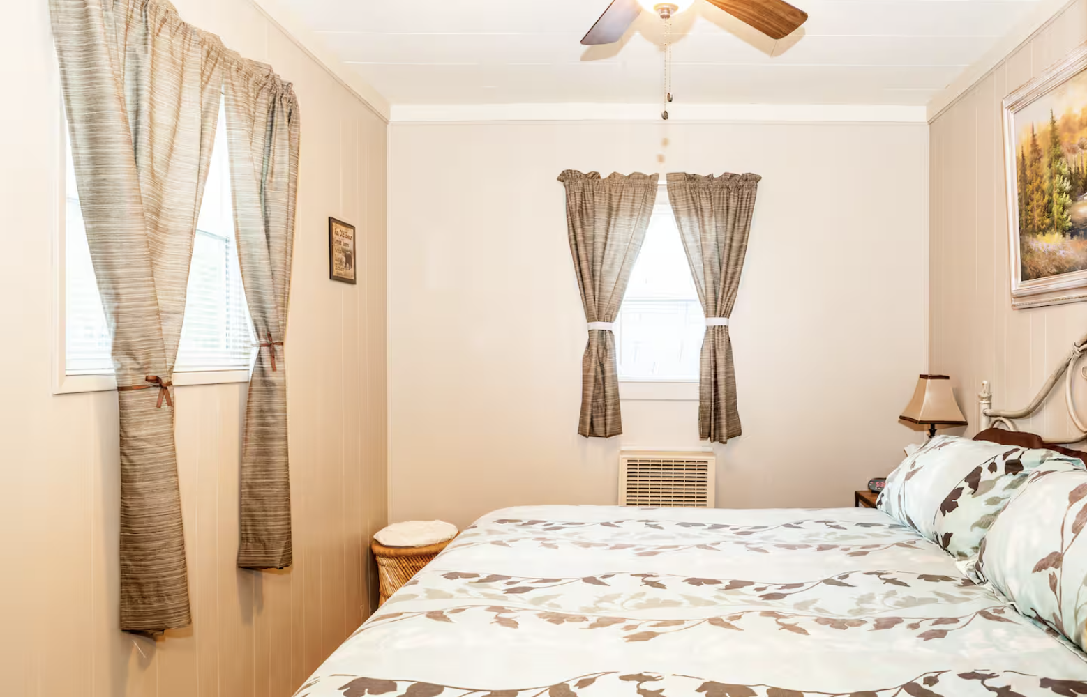 The second bedroom that is smaller but still very nice has a twin bed or a pull-out sofa, and it comes with the full bathroom which is fitted with a walk-in shower and a vanity, the tiles being cold and the mirror having a wooden frame that matches the cabin’s theme. With new fixtures and generous storage, the bathroom is like a small luxury, the steam from the shower mixing with the scent of pine coming from the logs.
