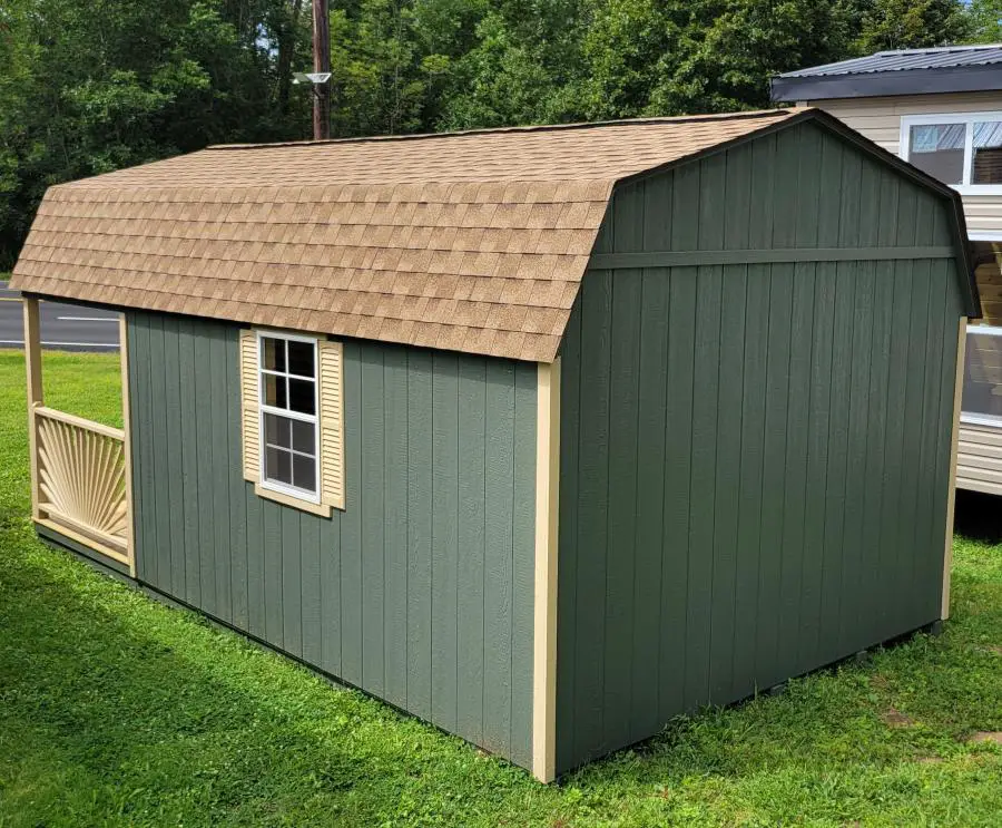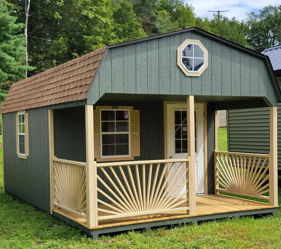 The 12×20 Dutch Cabin from Rocky Mountain Sheds is a pure storybook dream come true. The avocado siding, tan trim, Shakewood roof, and the grand 6×12 front porch topped with sunburst railing make this cabin an instant eye-catcher of any lot—currently available for a fabulous price of $9,351 delivered and set up.