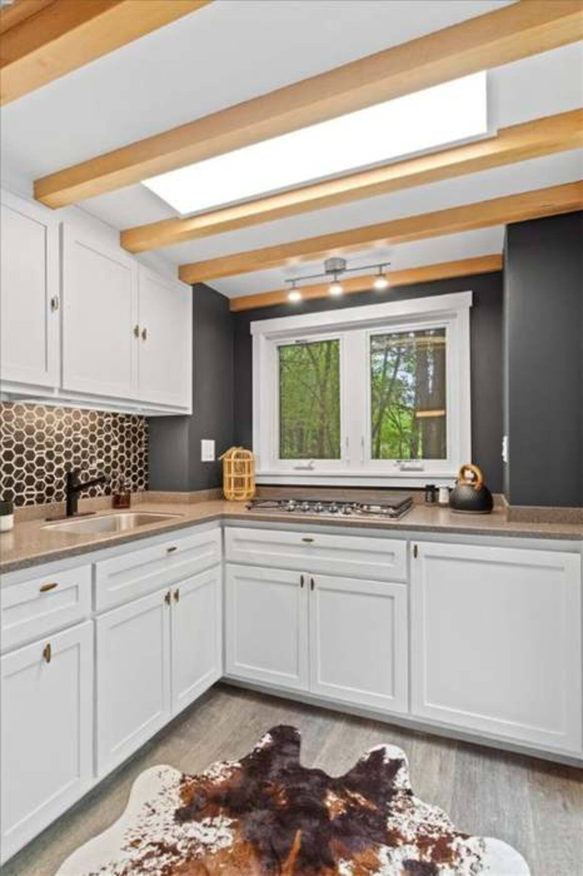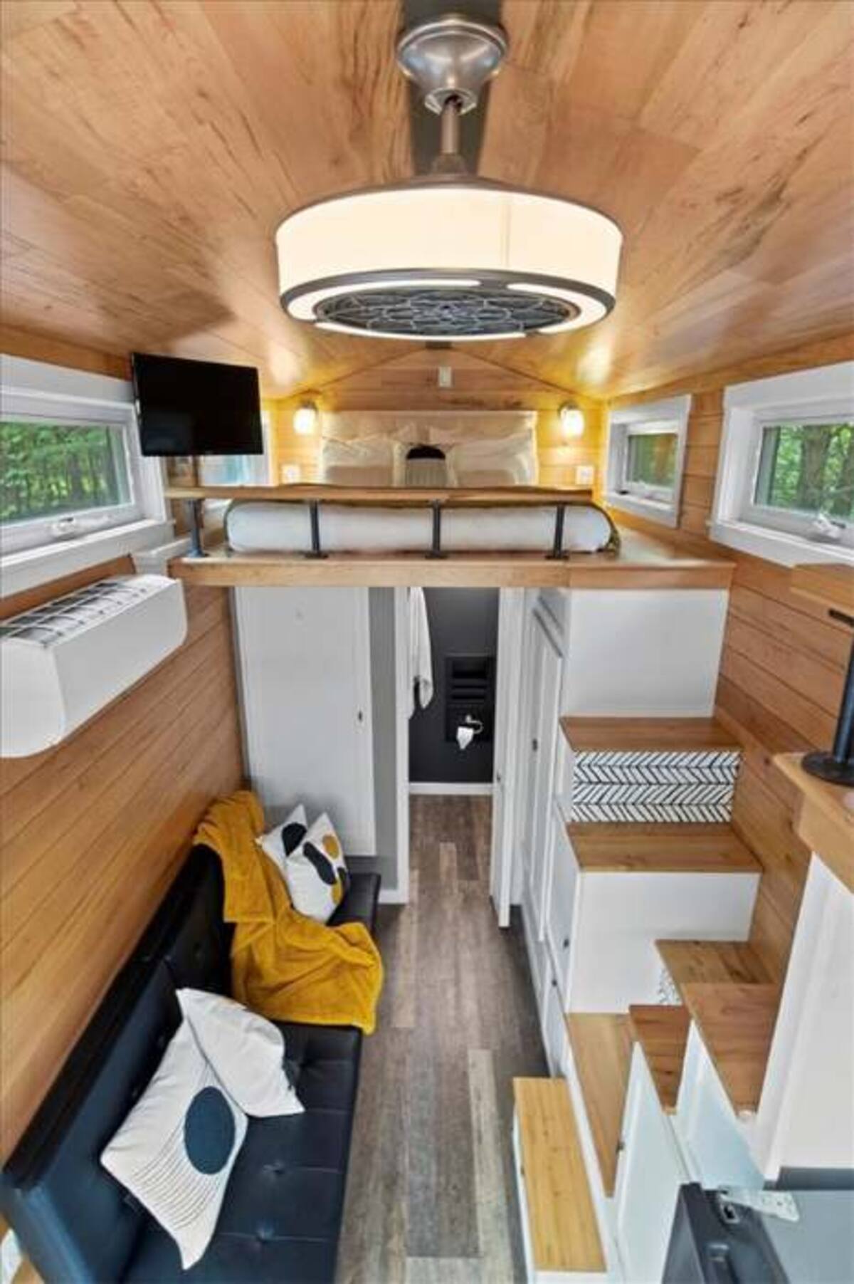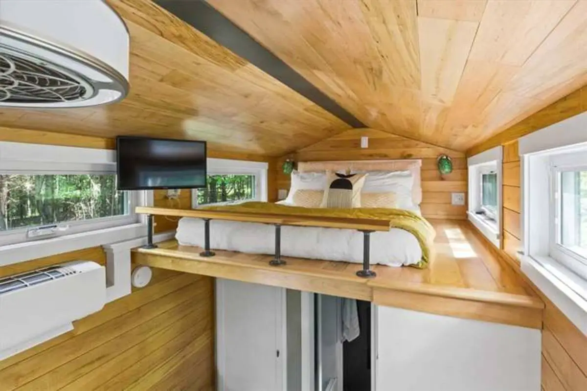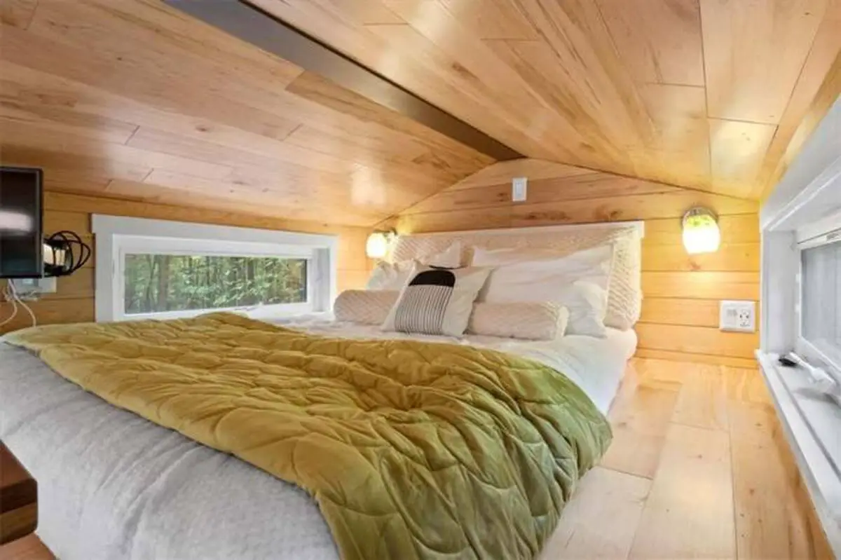 Stepping inside, the living room reveals a space that feels both cozy and open, its layout designed to gather light and warmth. The wood-paneled walls, with their natural grain, create a soft embrace, the furniture arranged to encourage conversation or quiet reflection. A sofa, perhaps in earth tones, invites you to sink in, the cushions cradling the body as the afternoon light filters through the windows. The flat-screen TV, mounted discreetly, offers a touch of modern ease, its screen a window to stories from afar, while the natural light from the large panes frames the view of the 5 acres beyond. This room becomes a heart of the tiny home, where the beauty lies in its ability to feel spacious despite the scale, the off-grid setup adding a layer of peaceful isolation that deepens the connection to the immediate surroundings.