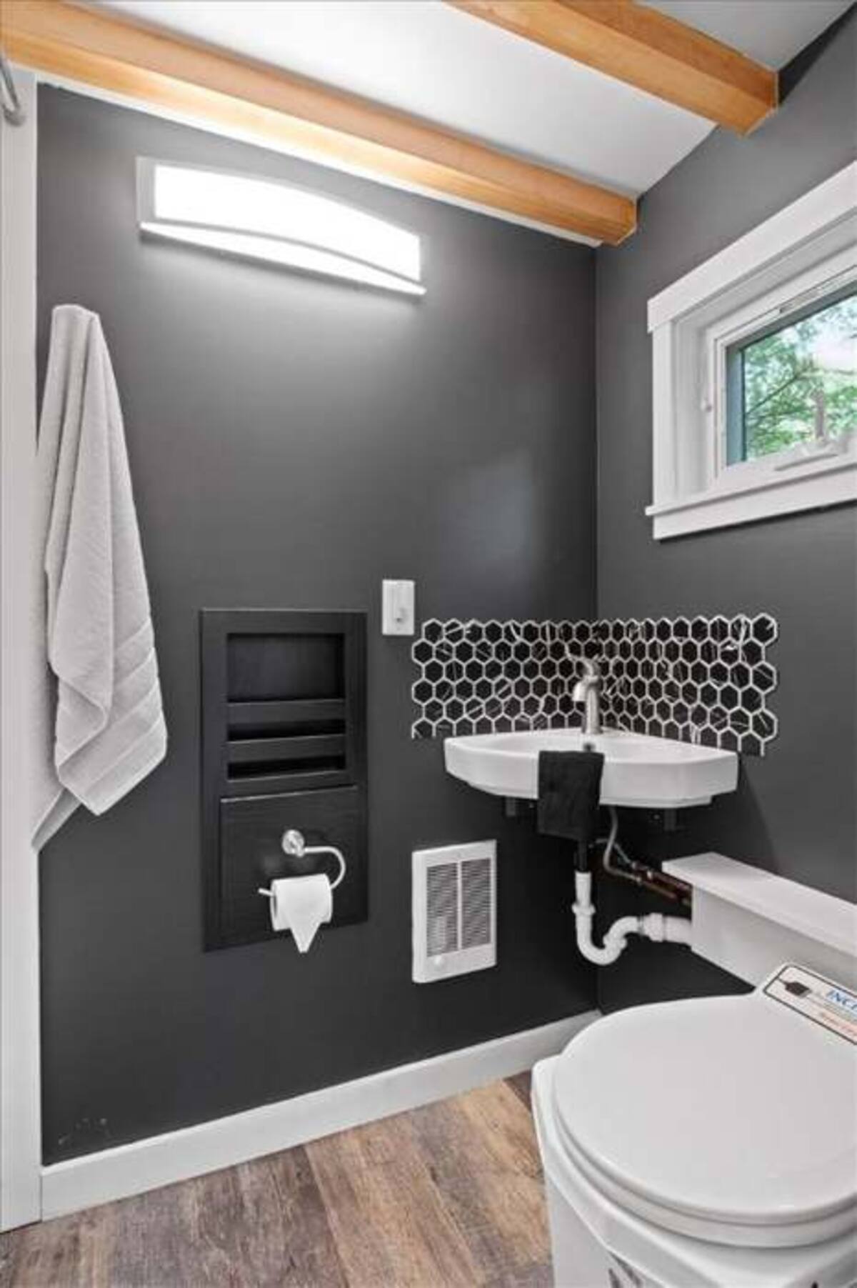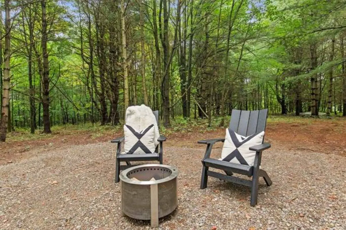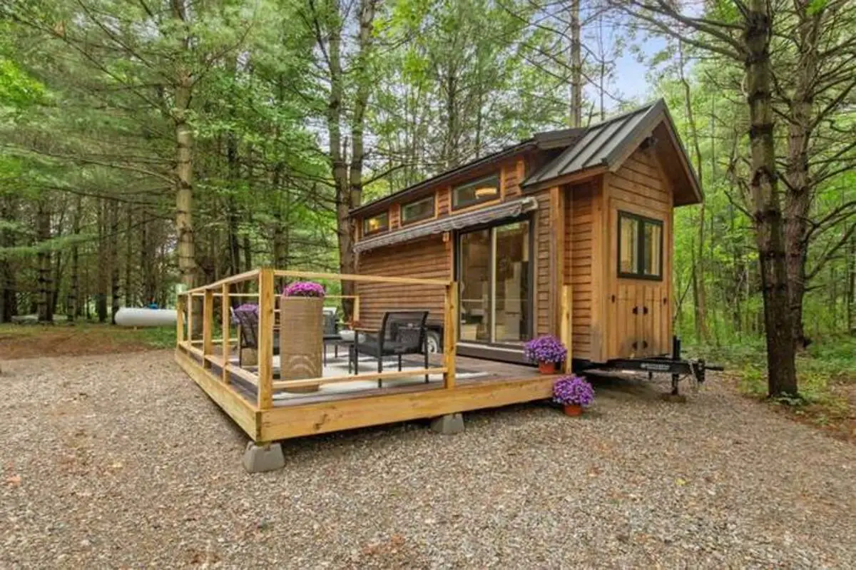 The off-grid elements of this tiny home retreat add a layer of enchantment, the 5 acres providing a buffer from the world, the solar or alternative power a subtle hum in the background. The bedrooms, with their separate spaces, become personal havens, the living room’s sofa bed a flexible addition for visitors. The kitchen’s full-sized refrigerator and oven turn cooking into an art, the microwave and toaster offering quick joys. The bathroom’s private amenities, with the shower’s steam and the vanity’s mirror, create a moment of self-care, the towels soft against the skin. This interplay of details crafts a retreat that feels both luxurious and grounded, a place where the Finger Lakes’ beauty becomes part of the daily story.