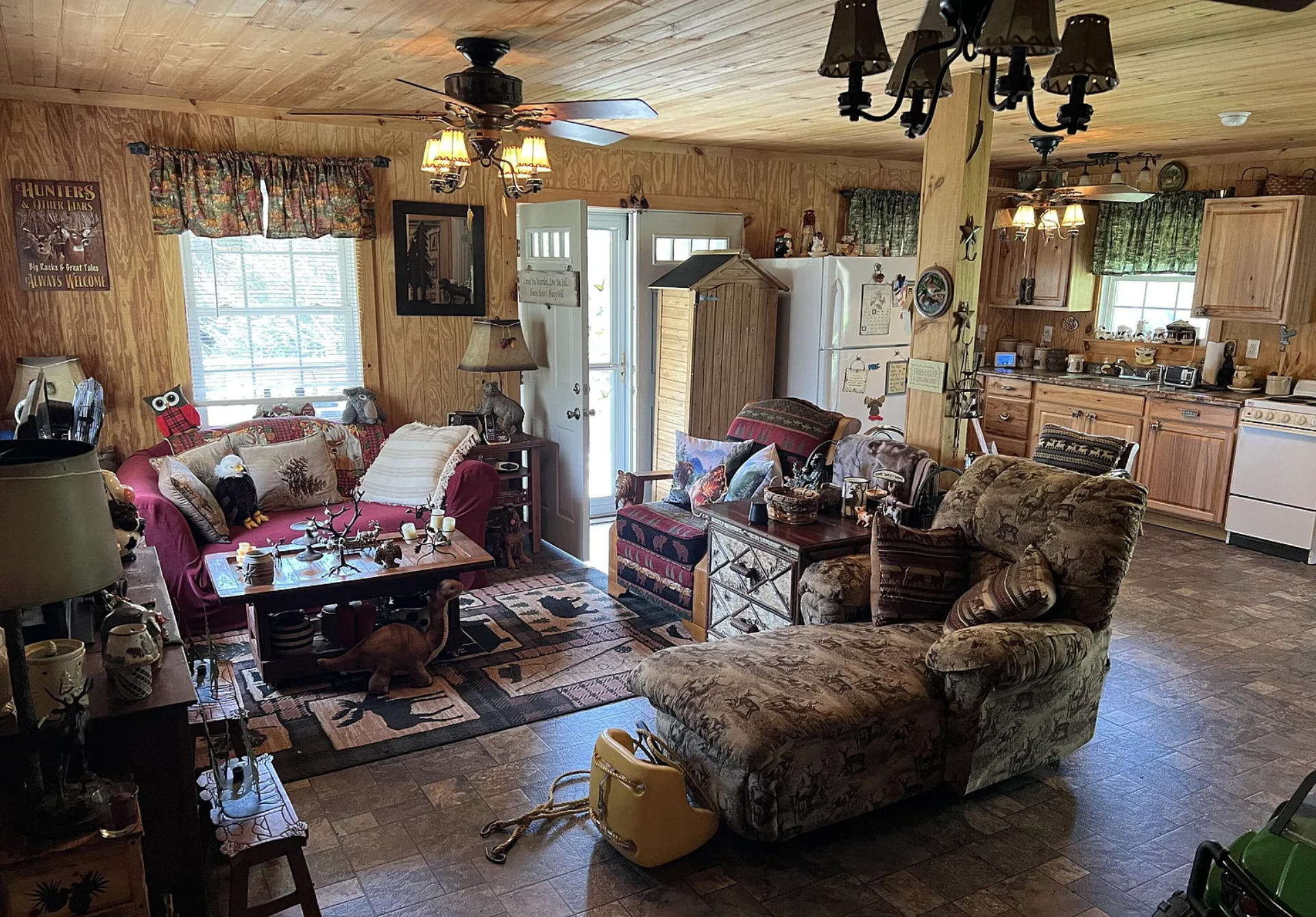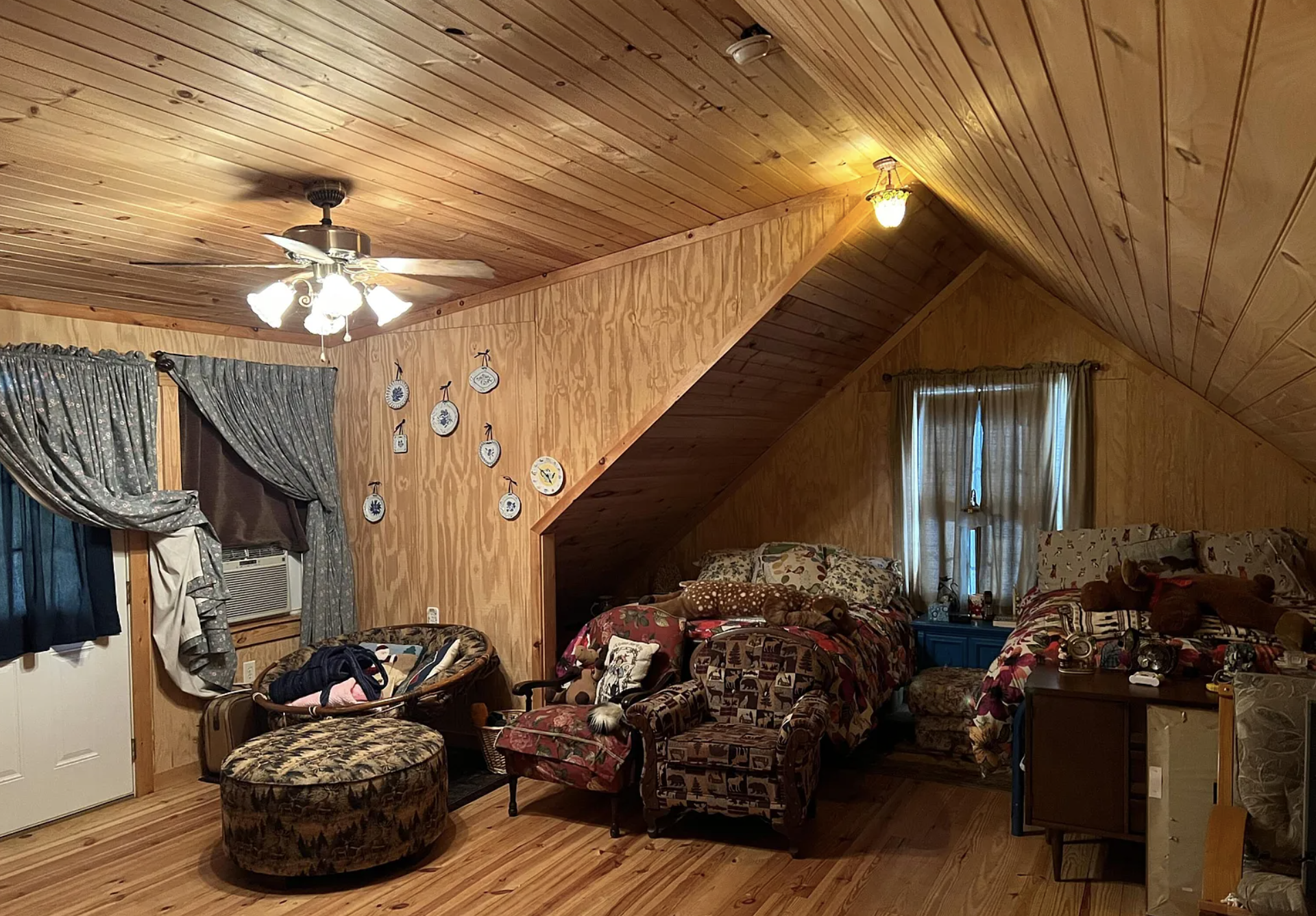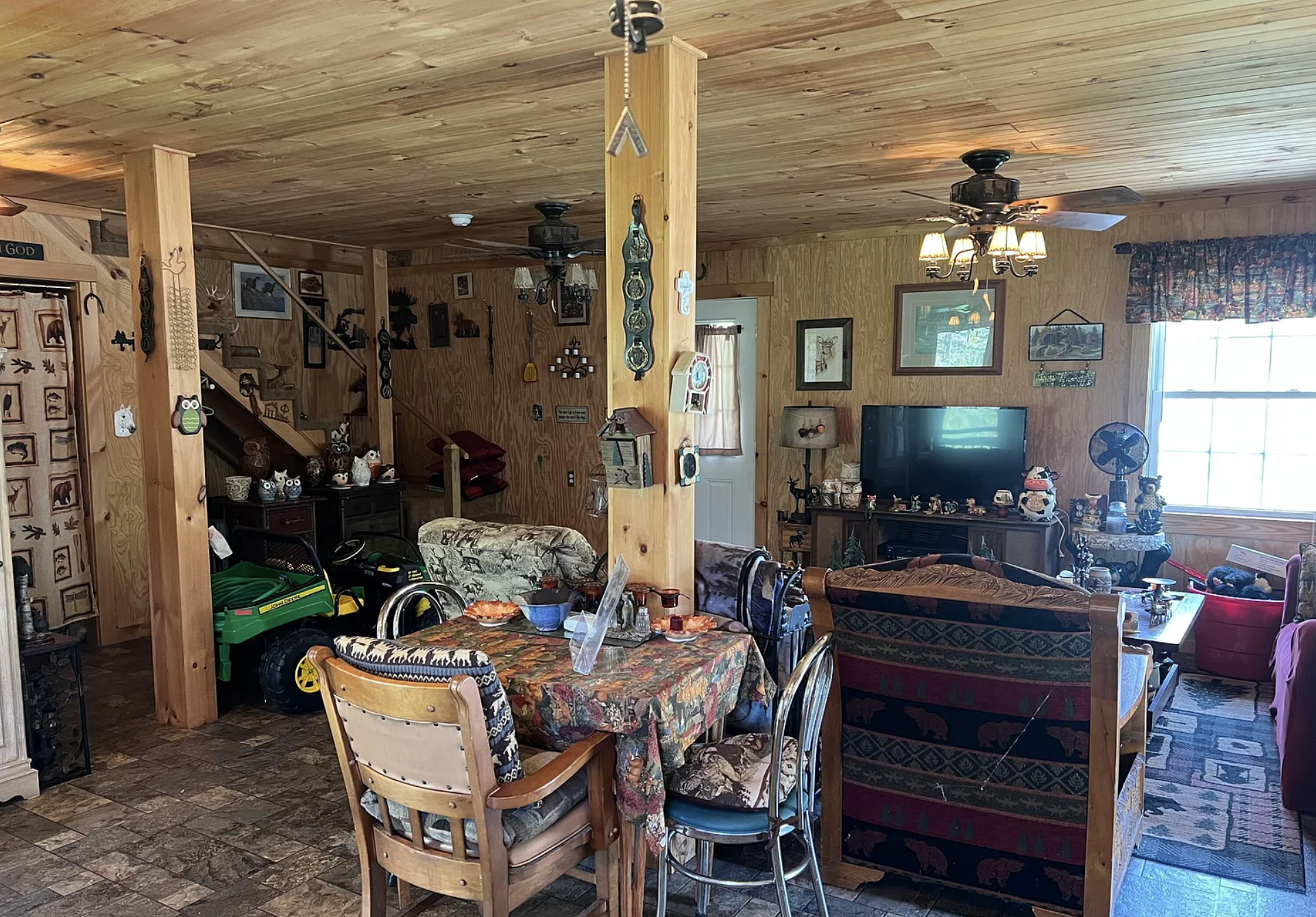 | Interior | Tongue & groove pine, open floor plan |