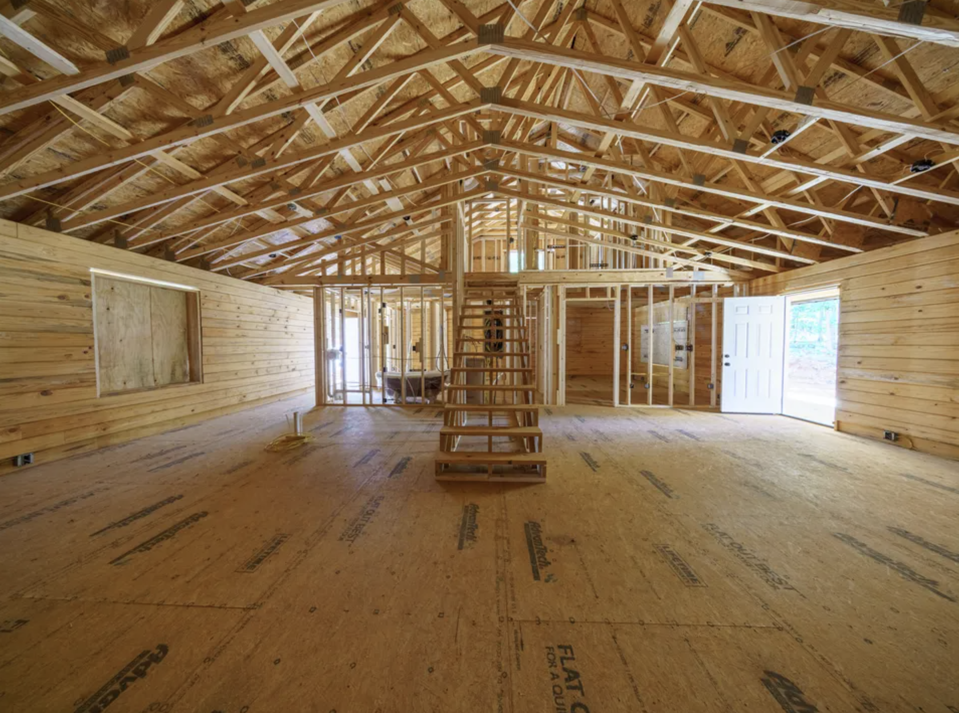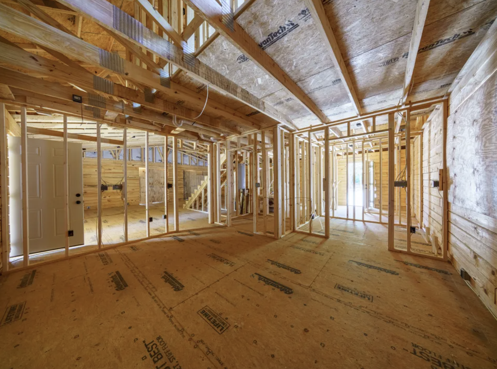 Impressively this land and house are sold for together $379, 500, and here the shell is basically that the property has the main systems and the structure for the house. The main floor layout is framed for two bedrooms and three full bathrooms, while the primary bedroom on the main floor is convenient and has porch access.