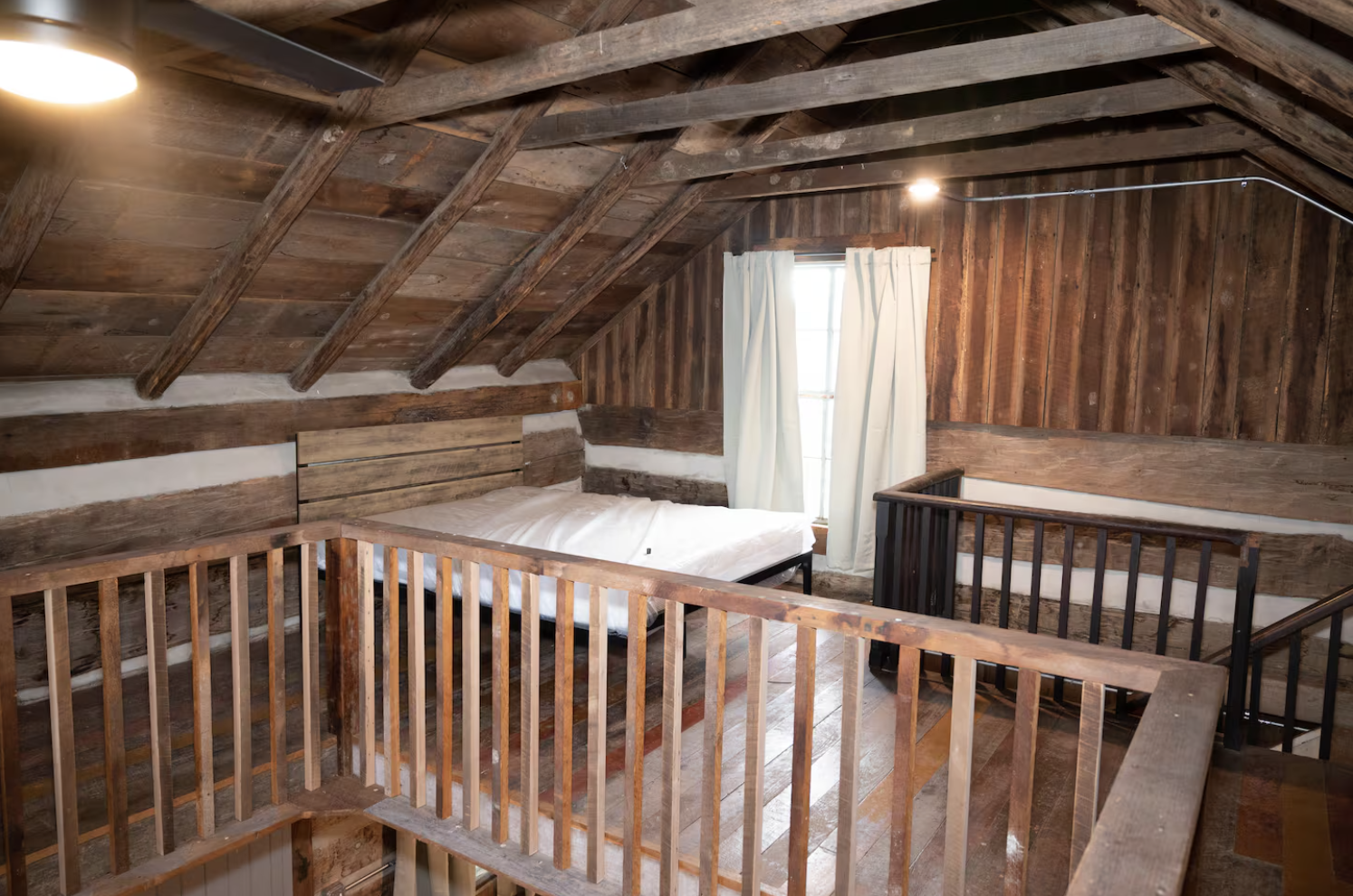 As the sun goes down, the golden logs reflect the light, the high ceilings let in the forest’s living essence, and the exposed beams, carrying the marks of early 20th-century craftsmanship, tell stories of the past. It is a modest, straightforward, and genuine place where morning light plays with shadows on the floors, the loft stands as a quiet meditation spot, and every single thing from the interior’s warmth to the wind’s soft murmur syncs up with nature.