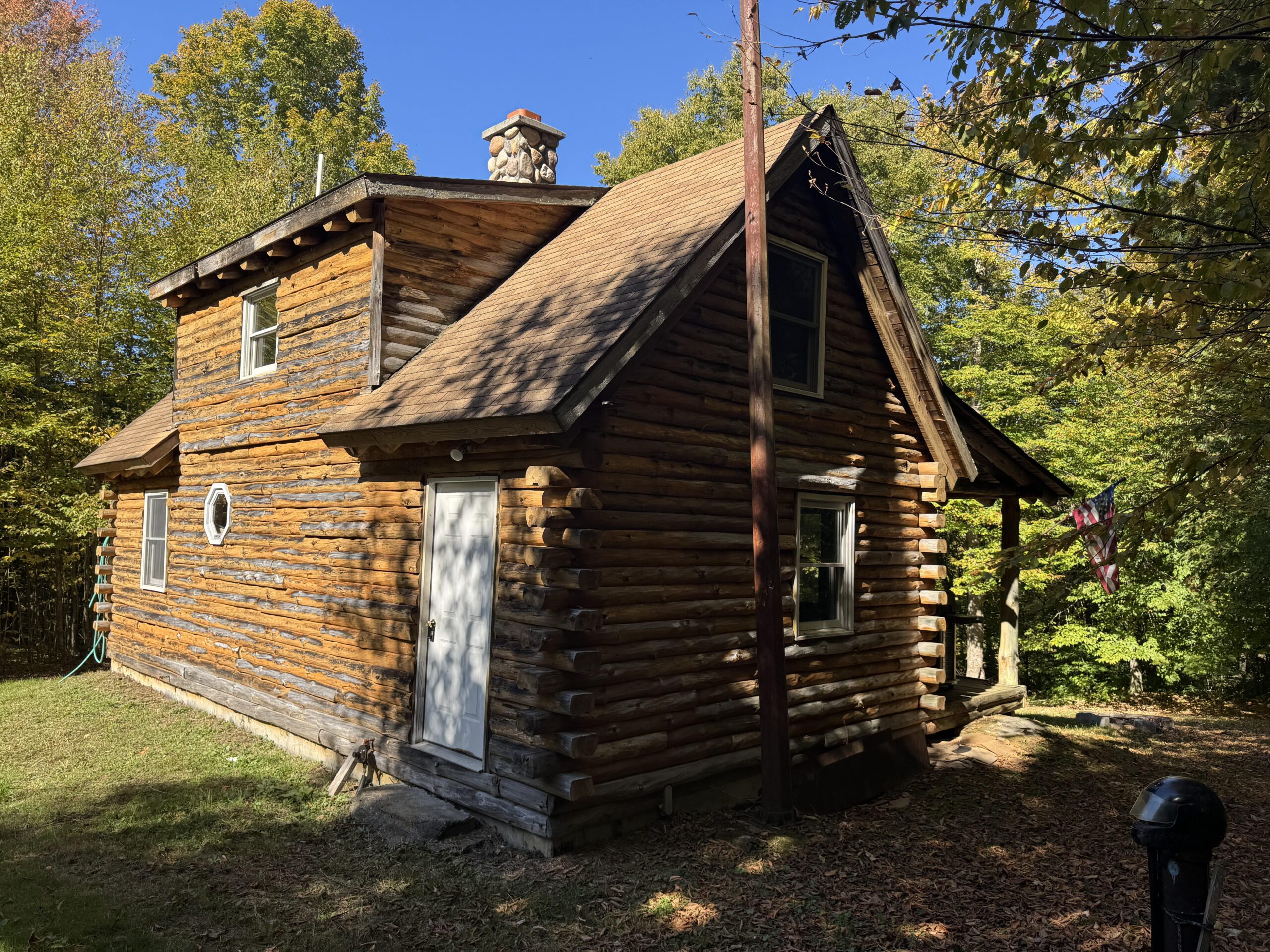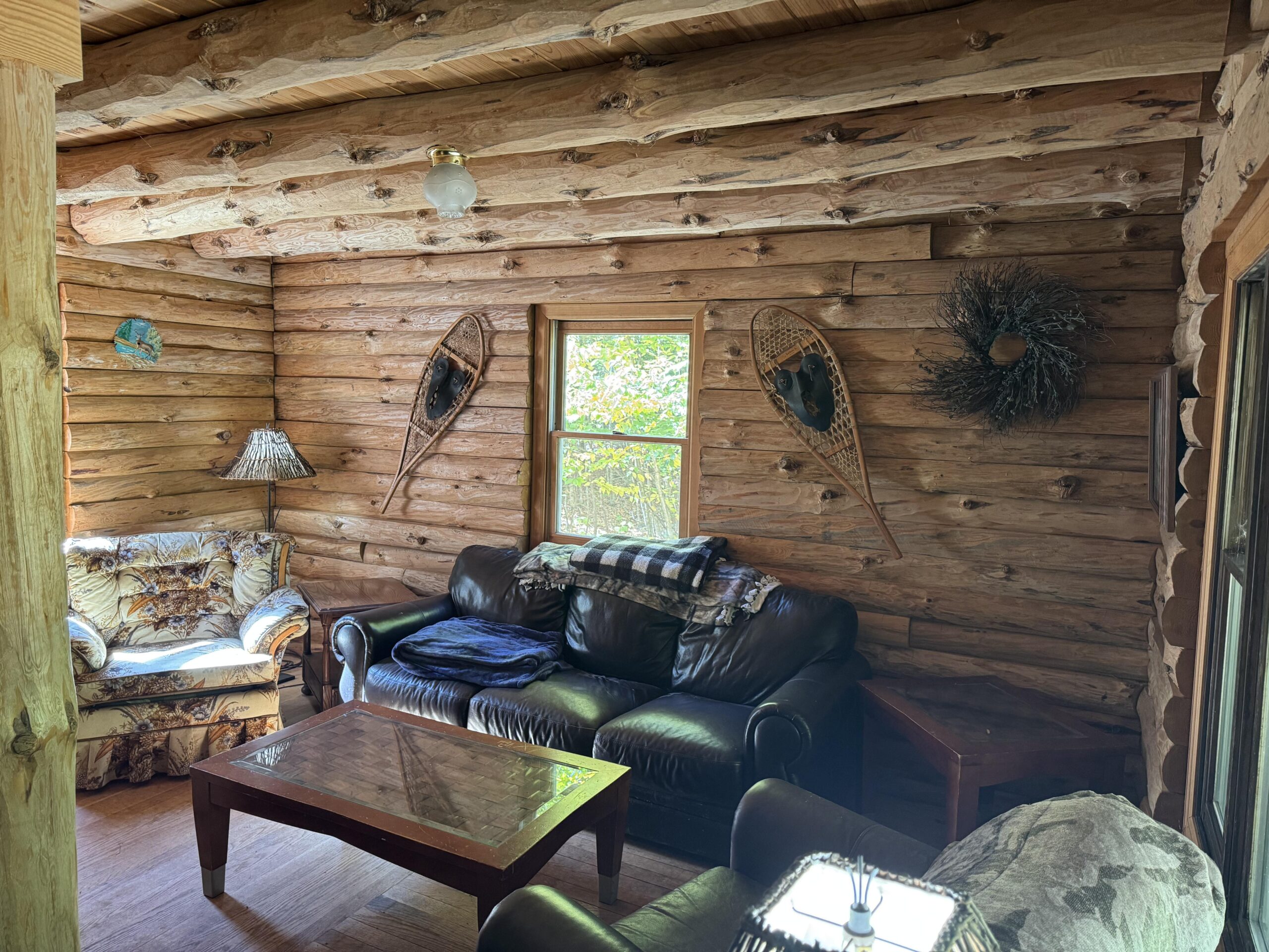 The cabin greets you like a traditional postcard from the moment the long private driveway leads to the clearing: warm wooden siding, a strong metal roof made to withstand the heaviest lake-effect snows, and a big covered front porch that practically invites you to sit with your coffee and watch deer wander through your own 45-acre backyard.