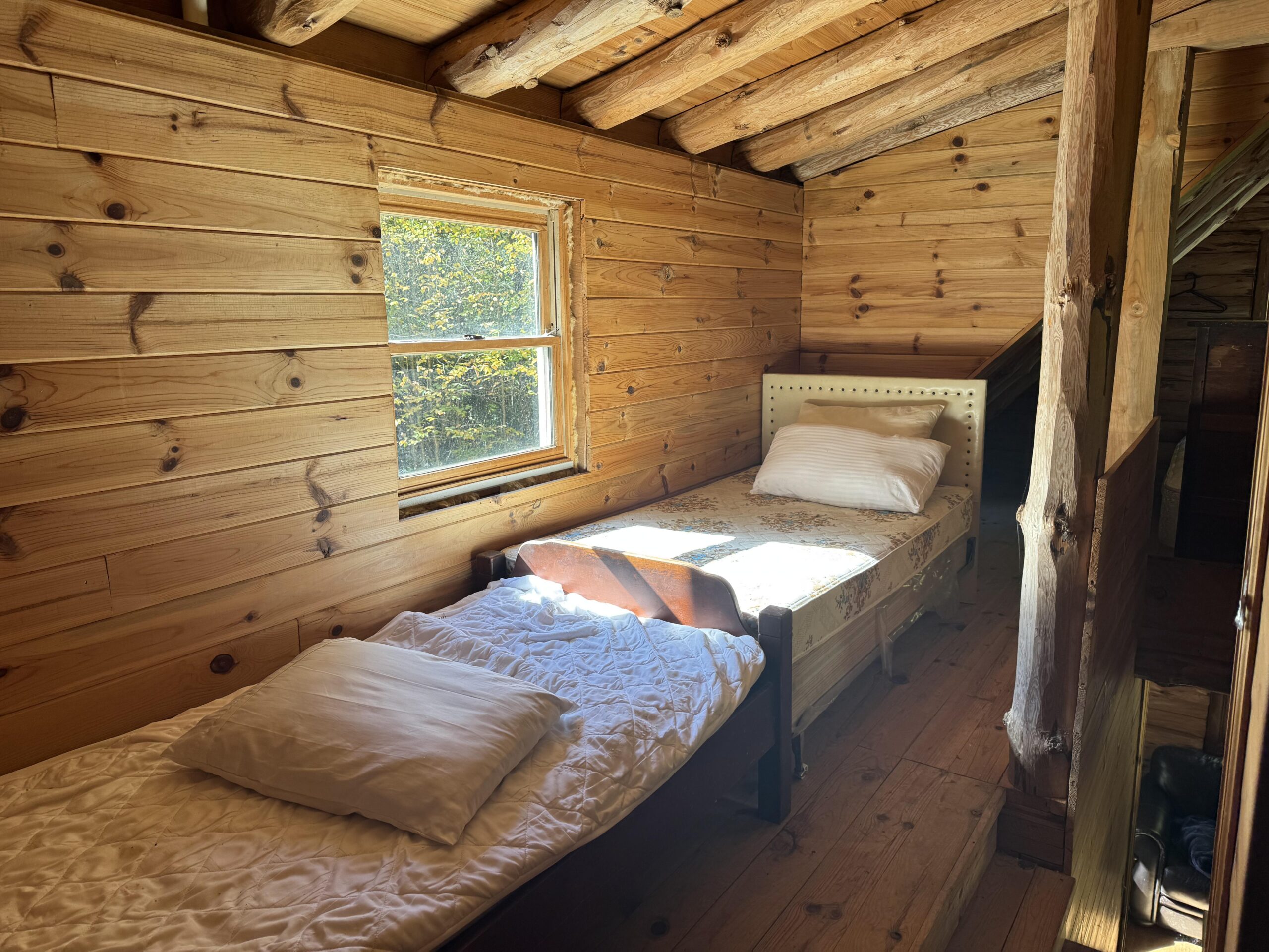 When you come in, the cabin is an instant hit with its warm and welcoming atmosphere. The main floor through its open and cosy design greets you with: a bright eat-in kitchen with lots of cabinet space, a comfortable living room heated by a wood stove, and a full bathroom with modern fixtures. Large windows offer uninterrupted forest views, while the central vacuum system is a considerate feature that most off-grid cabins lack.