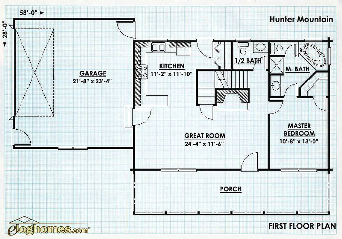 The Hunter Mountain cabin from eLoghomes is a charmingly simple log cabin model which merges the rugged mountain allure with the convenience of daily life. It has 1,261 heated square feet spread over 1.5 levels. The well thought out Hunter Mountain cabin has 3 bedrooms, 2 bathrooms, a large 288-square-foot front porch, and an ample 529-square-foot attached garage – a perfect combination of features for a mountain-loving crowd, a family, or simply a functional mountain retreat seeker. The Hunter Mountain cabin with a master suite on the first floor, an open great room, and efficient bedrooms on the upper level, is able to deliver comfort, storage, and easy indoor-outdoor transition in a compact yet highly livable package.