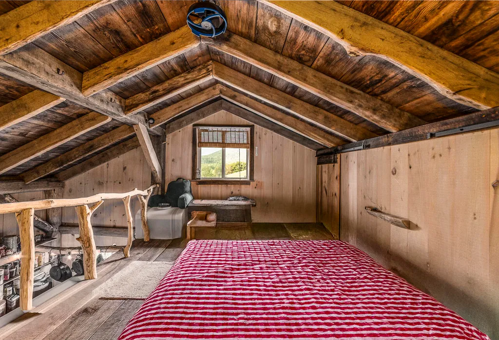 The bedroom loft is an idyllic resort with a queen bed placed under the declining ceiling, lots of space for beddings and clothing, and pretty easy access to the complete bathroom that has the new fixtures and tiled floors. The loft conception is giving a cozy treehouse-like touch which is ideal for the most peaceful rest, forest sounds surrounding you.