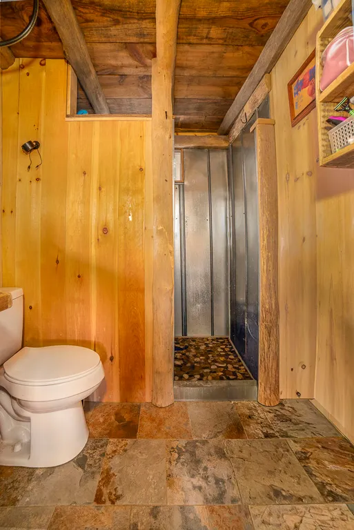 There is one full bathroom only and it is in the middle of the house, tub/shower combo, vanity, and new fixtures included which make the morning routines very easy and without stress. Some of the clever things in the cabin like the water collection method for eco-friendliness, the generator hookup for ease, and the septic privy for off-grid living making the place feel like it is done in an old-fashioned way, great in the balance of rustic soul and modern ease.