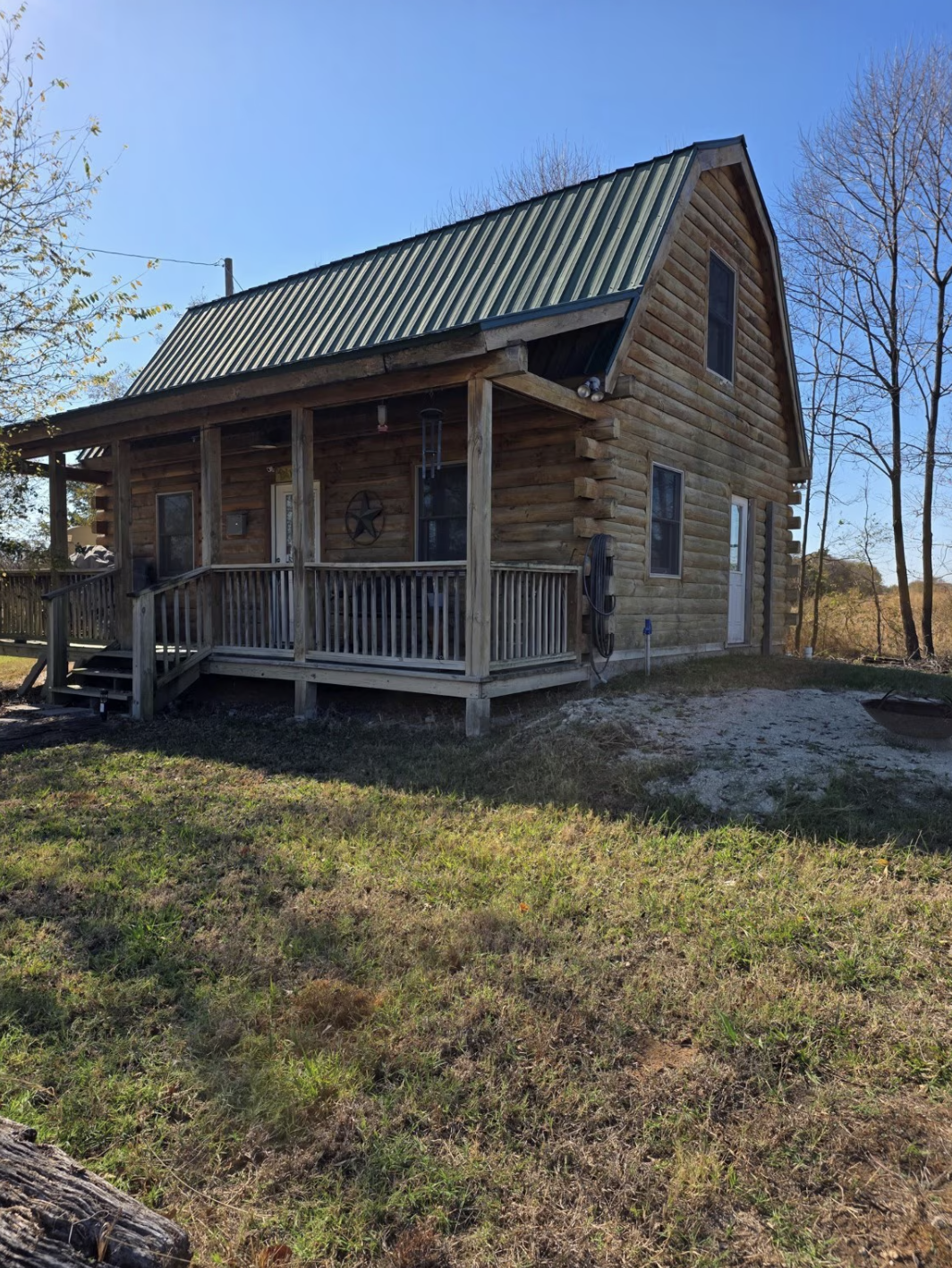Outdoor living is very appealing as the cabin porch spans the entire length of the side openings through which one enjoys nice sceneries of the clearing and the woods. Corner location for the lot of almost an acre offers privacy besides being draw by nature; acreage is large enough for further building, gardening, or just use for the taking of the tranquil atmosphere of the Texas landscape.