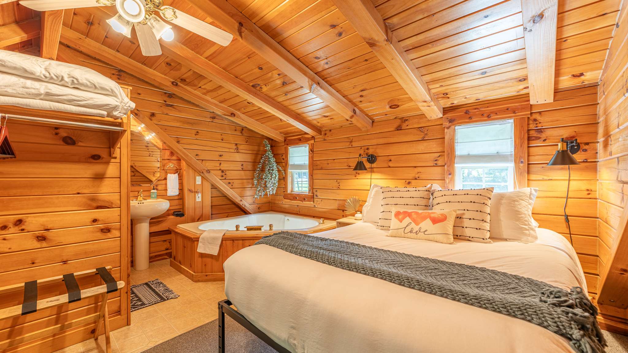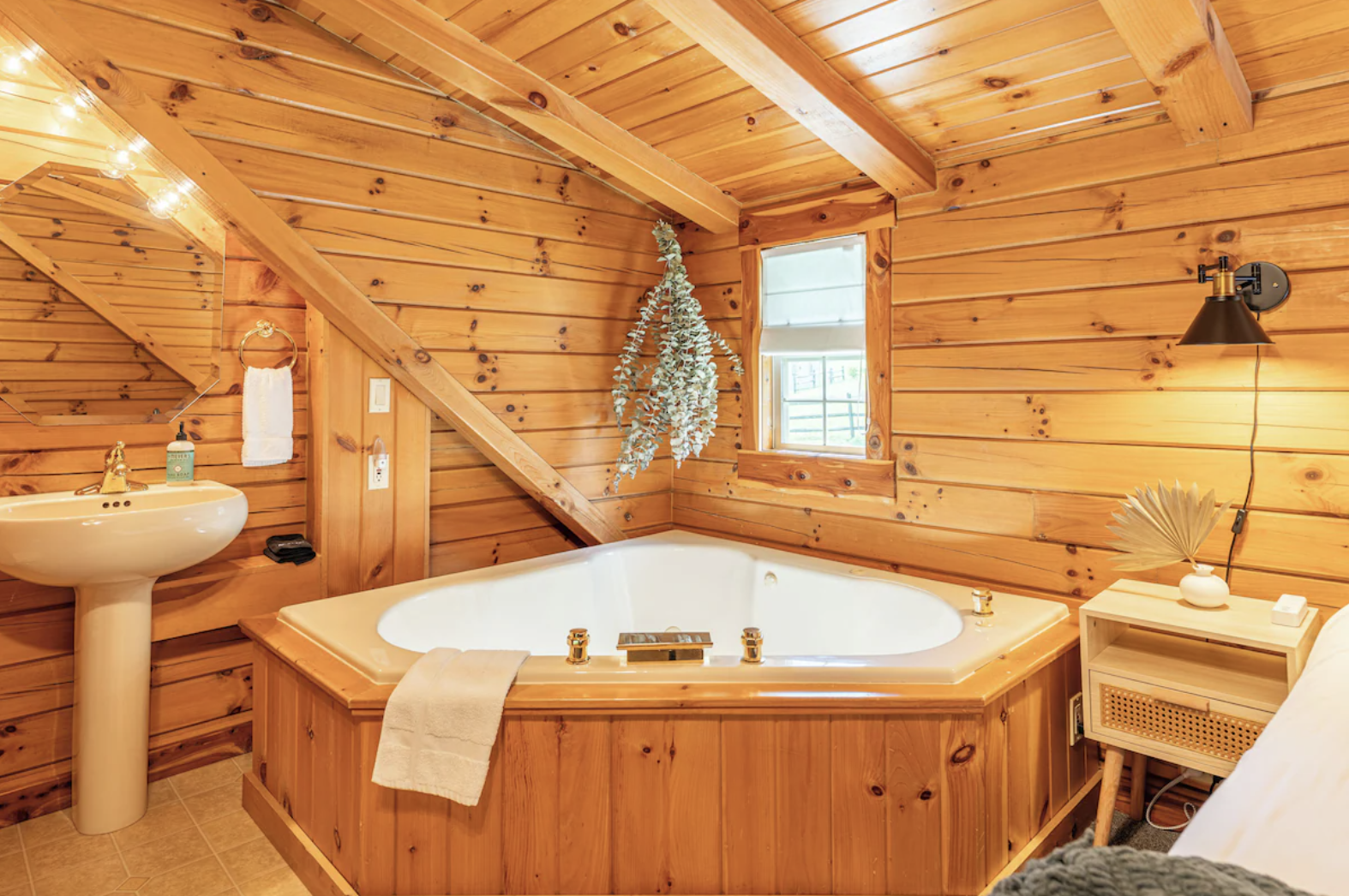 There is also a bathroom on the main floor which may pleasantly surprise you because a washer and dryer are tucked away in it and there is a lot of space for the morning rituals. The loft bedroom upstairs is just like a dream. There is a comfortable queen bed under a sloped ceiling and soft linens and reading lamps contribute to the treehouse-like intimacy concept. Besides, an en-suite half bath includes a jacuzzi tub of a luxurious type which is ideal for long and completely relaxing soaking sessions after a day of backroad exploring in Amish Country.