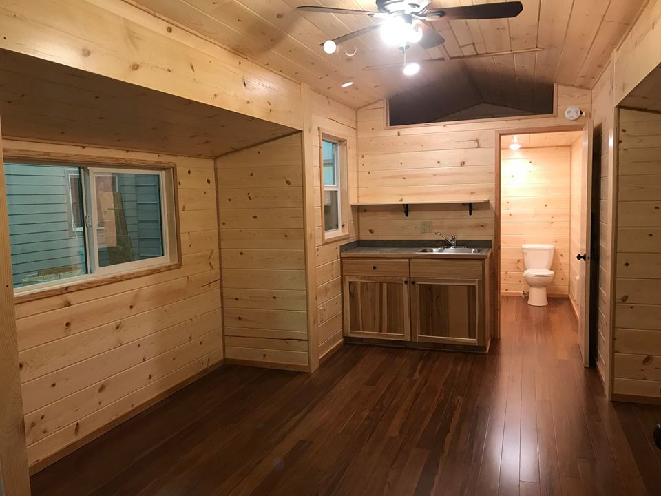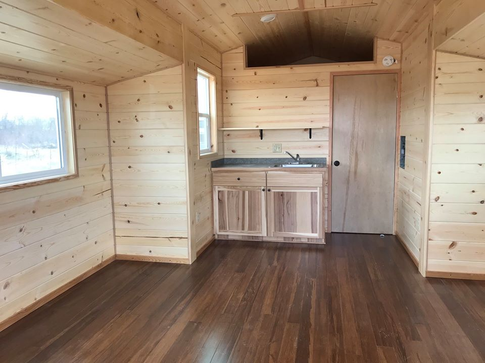 The bedroom downstairs is a peaceful sanctuary, spacious enough for a king-size bed with enough floor area for walking, or other pieces of furniture such as a dresser or chair, the room being large due to the push-out walls. The loft upstairs has a plywood floor and removable ladder access, and thus, can be a versatile upper level for sleeping or storing things, the low ceiling giving an intimate, treehouse-like feel which can be used by kids or for a quiet nap. The living room is equipped with a ceiling fan to facilitate air movement while a 50-amp RV power cord with 120-amp panel is there to ensure the smooth running of everything from the 30-gallon electric water heater to the electric heat in the bathroom. The wood finishing in the interior of the house, i.e., the Oregon-style trim, the lacquered surfaces, etc., is at a whole different beautiful level of the texture, thus transforming the cabin into something that looks like a bespoke build rather than a kit, a place where light changes across the grain just like sun rays on river water.