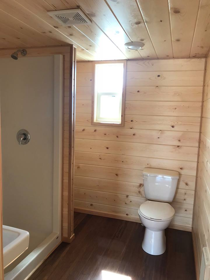. The main floor is covered with laminate flooring which is both durable and easy to clean, whereas the walls and ceiling are covered with wood and finished with two coats of lacquer which provides a homely feel and gives an aroma of fresh pine. The bathroom, located at the back, is fitted with a 48×36-inch fiberglass shower, on-demand propane water heater, hand sink, and regular toilet; it is a space that is equal parts practical and attractive, and the one-piece shower is gleaming white which provides a nice contrast with the wood tones.