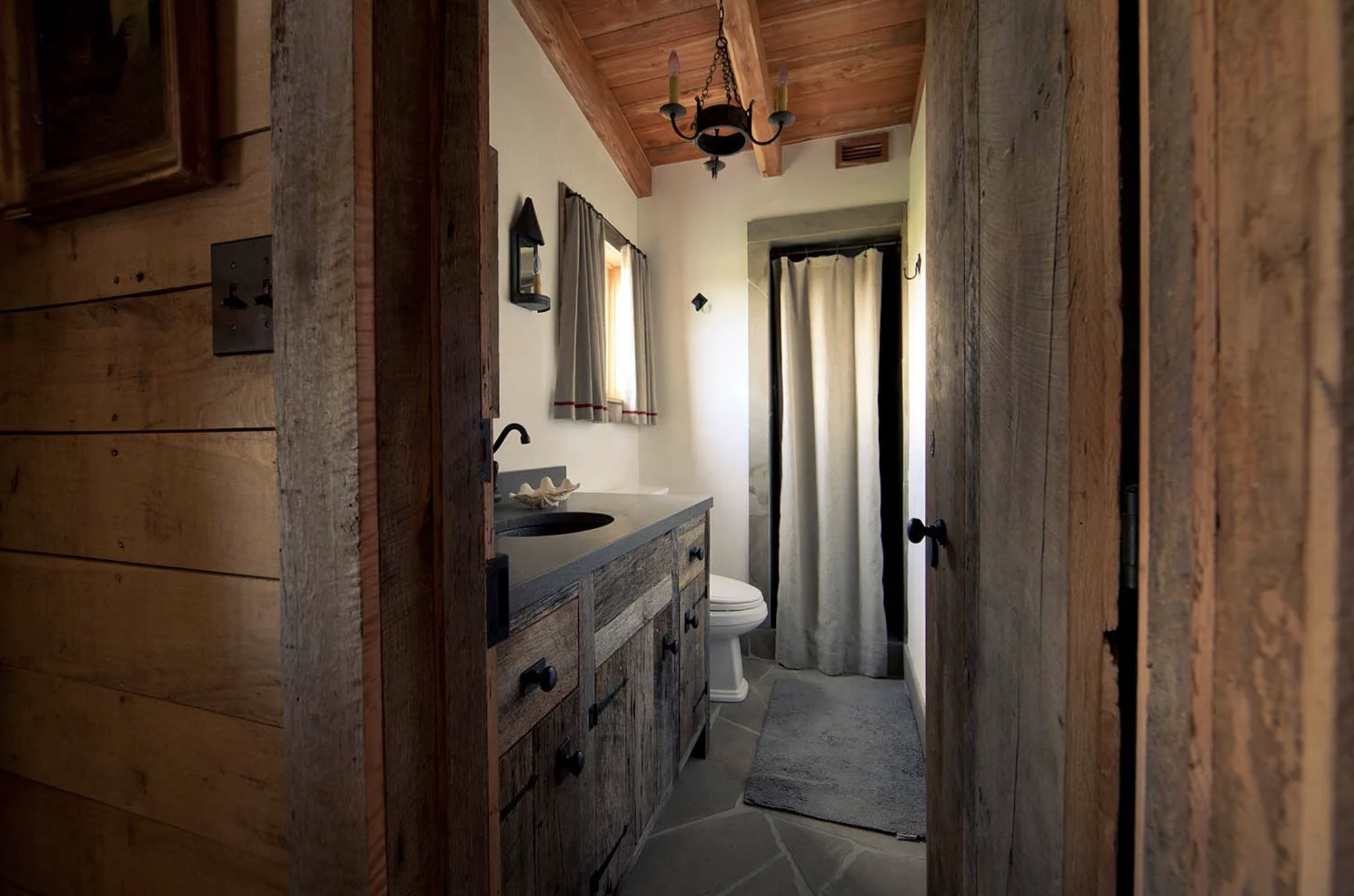 The restroom has a walk-in shower and has been modernized to be comfortable, with clean fixtures and good water pressure. Guests will also find Texas Lavender bath products and a hairdryer for additional convenience. The space is designed to serve guests efficiently while maintaining the cabin’s overall rustic aesthetic.