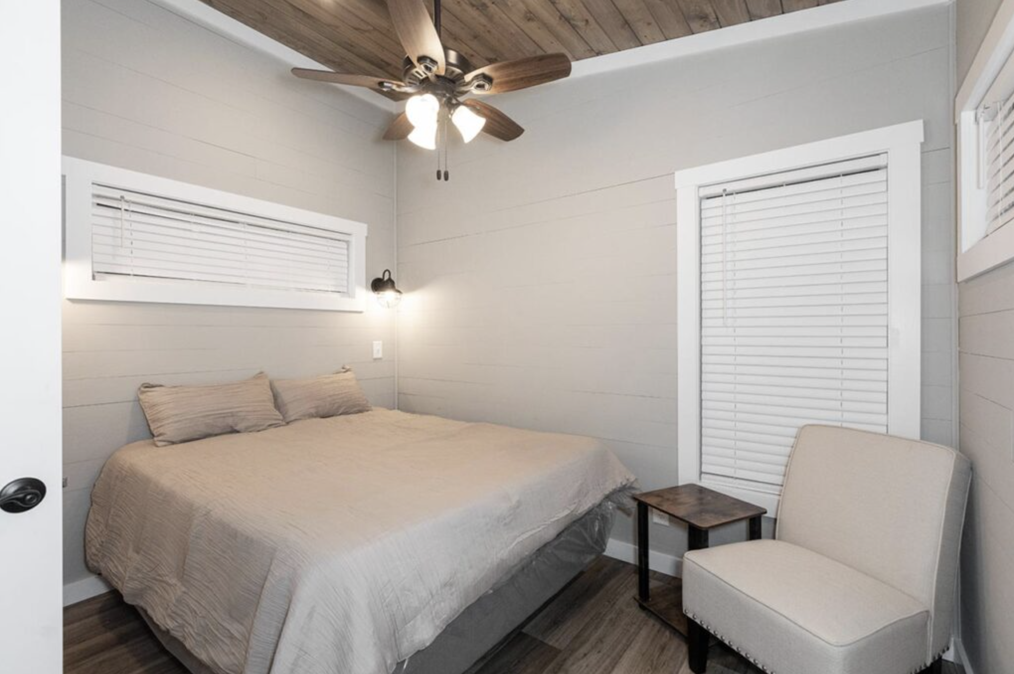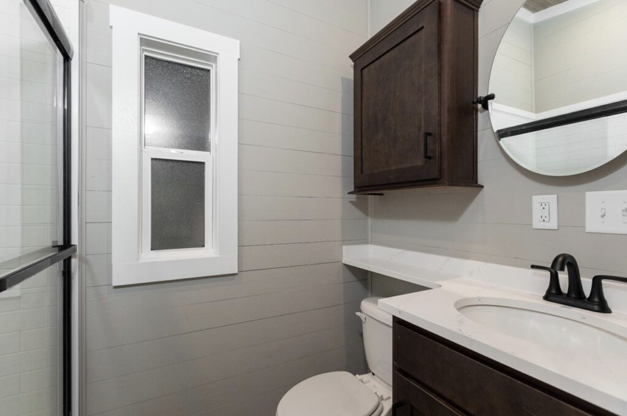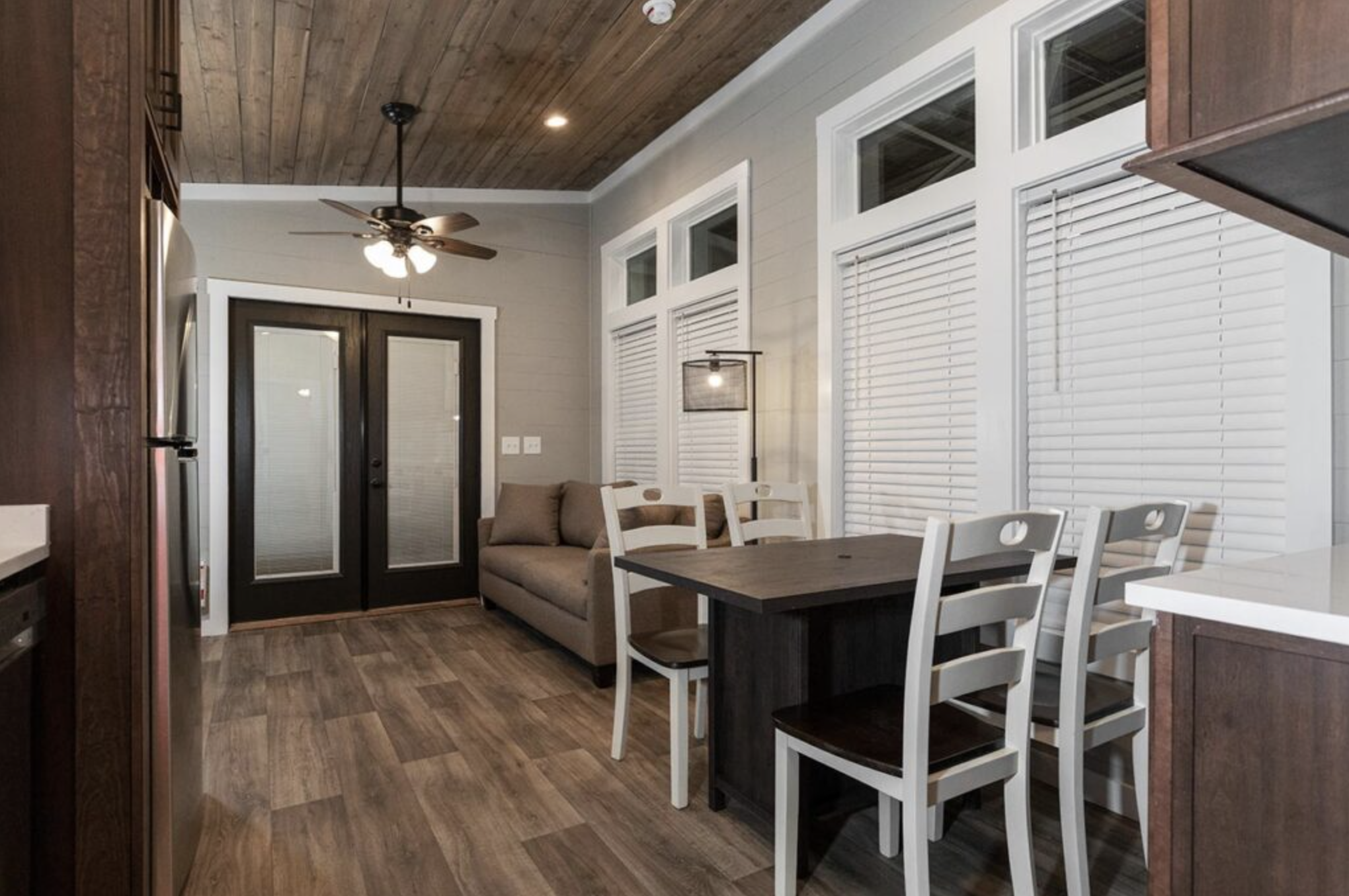 The equipped cooking space is the antithesis of what you expect in a small home but rather in a miniature form, it is a chef’s dream. Beautifully Tranquility Quartz countertops complement Timberlake cabinets that provide lots of storage without the space being overpowered. The farmhouse sink with the spring-neck faucet gives the kitchen a rustic charm, while an 18-inch dishwasher and a complete set of stainless steel appliances make cooking a breeze. A tankless water heater on-demand is there to provide hot water always – a real luxury in a compact living area.