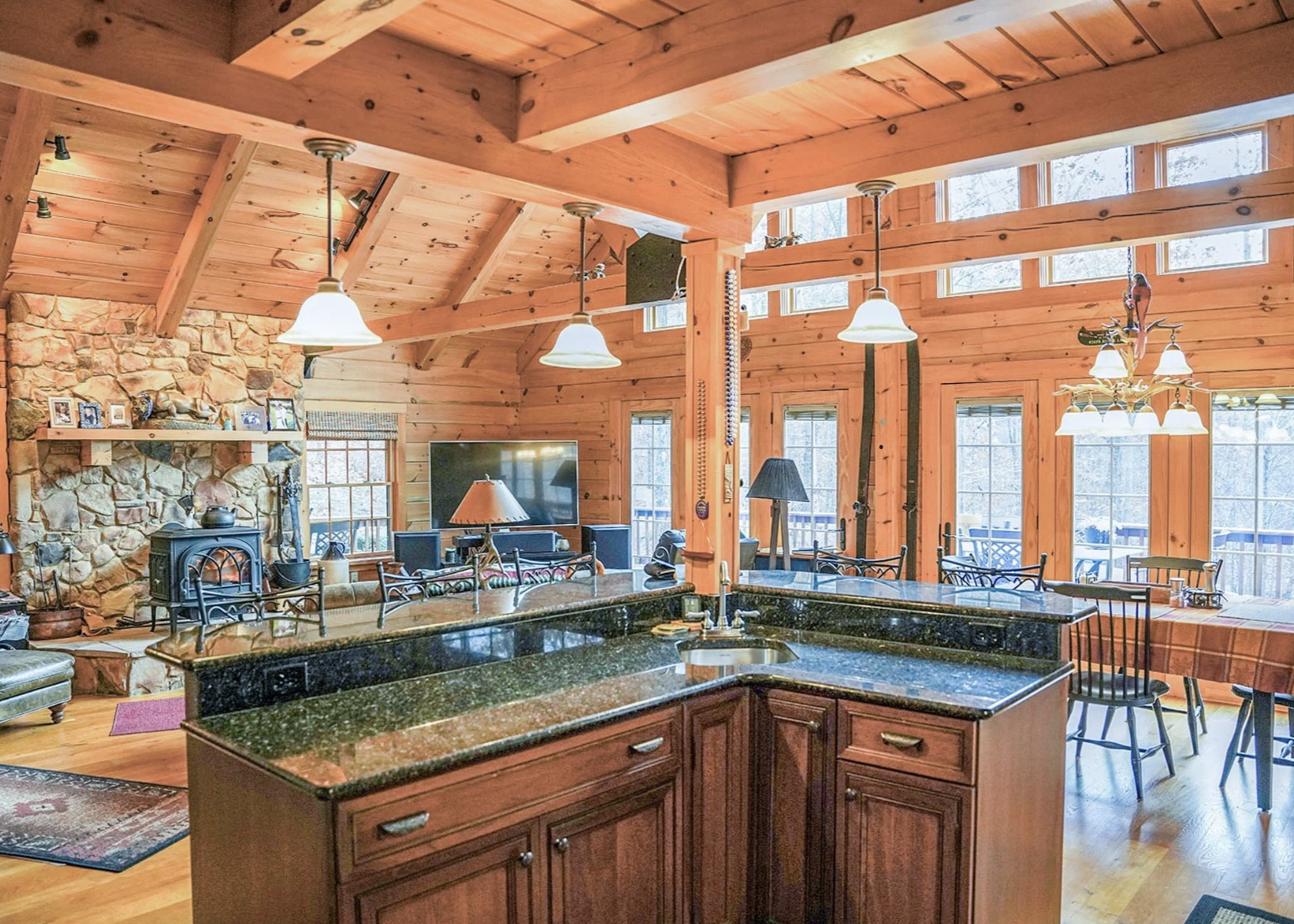 The facade of the Ridgewood is an eye-catcher with the typical Cape Cod features being mellowed out by the log construction whose natural golden color reflects the sun in a way that is different for each season. The wraparound deck, which is both large and welcoming, goes around the house like a friendly hug, the boards being nice to walk on and broad enough for chairs, tables, or a hammock to be placed. You can take shelter in the two covered porches if it rains while enjoying your book or having a chat with a friend, the gentle slope of the roof making it easy for the snow to slide off and the full glass wall at the back allowing the sun to brighten up the interior.