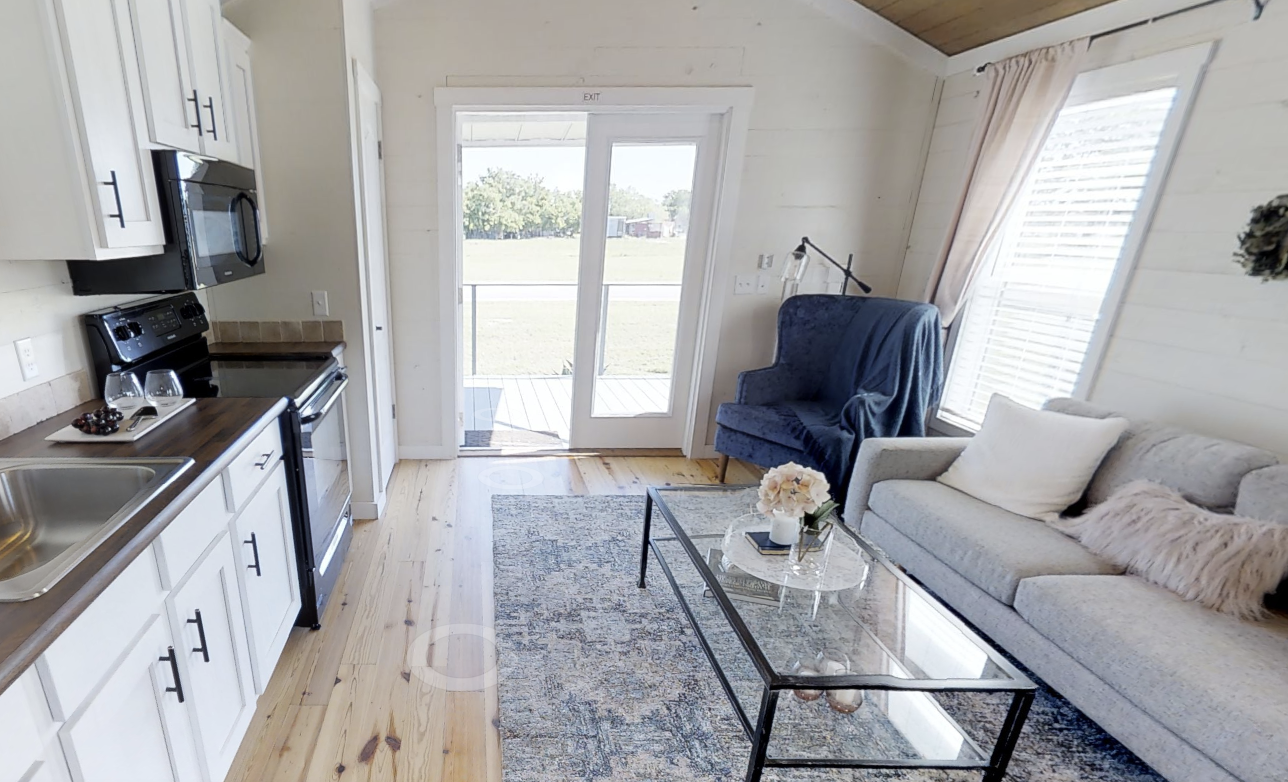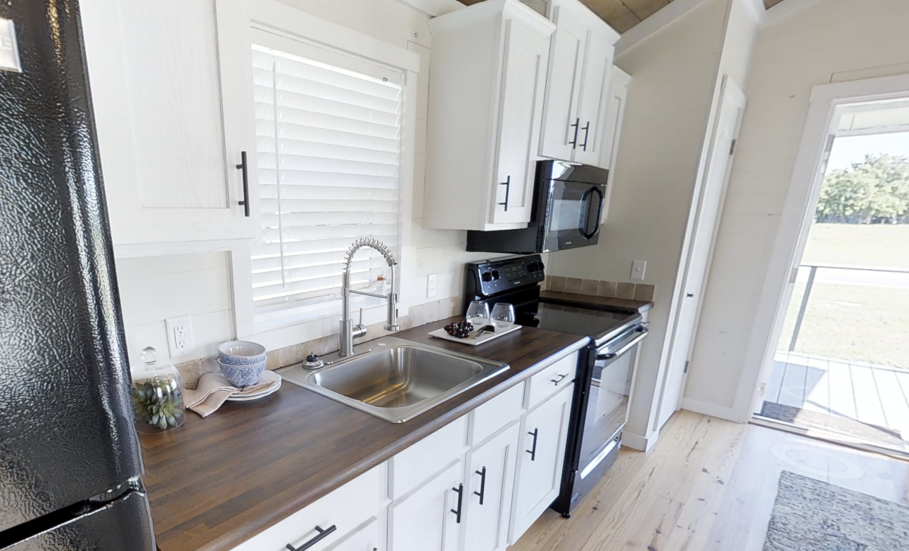 The kitchen, a galley of sleek elegance, steals the heart with its large design that belies the cottage’s size. The wood cabinets, fitted with oil-rubbed bronze pulls, open to reveal ample storage, their warm tones echoing the shiplap walls. The optional four-burner smoothtop range and microwave over the range stand ready for culinary adventures, while the stainless steel apron sink and gooseneck faucet add a touch of modern flair. The full-sized refrigerator hums quietly, its presence a practical anchor, the optional engineered hardwood flooring beneath tying the room to the home’s rustic soul. I can imagine standing here, chopping herbs from the nearby hills, the light streaming in to dance across the counters—a kitchen where every meal feels like a celebration, its beauty in the blend of function and finesse.