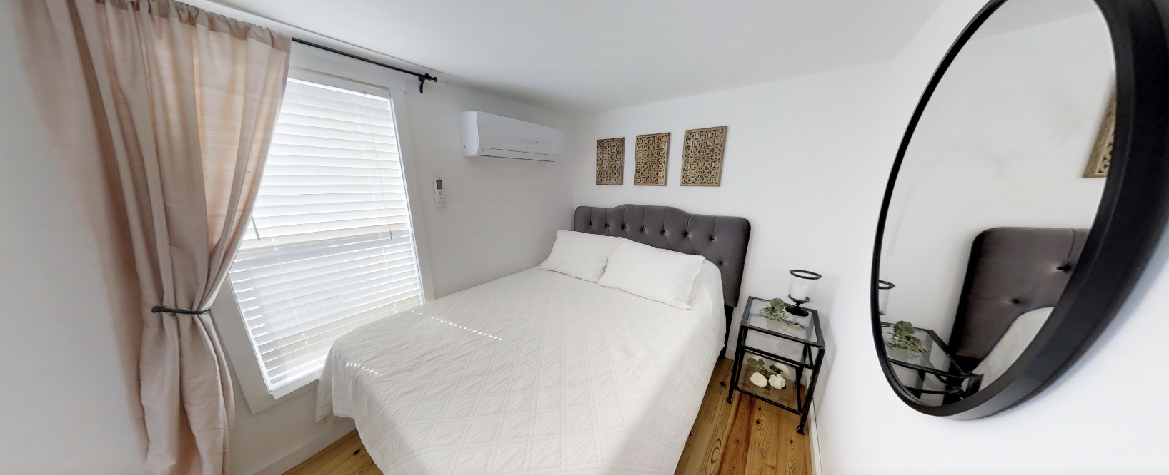 The primary bedroom suite emerges as a sanctuary, its comfortable queen bed a promise of deep rest, the walls’ shiplap texture a tactile delight against the morning light. The oversized full bathroom flows seamlessly from this retreat, its 60-inch fiberglass shower a luxurious expanse framed by a glass door that reflects the room’s light. The wood vanity, adorned with oil-rubbed bronze faucets and accents, offers storage and a spacious counter where a morning routine becomes a ritual, the ample surface a canvas for personal touches. This bathroom’s beauty lies in its generous proportions and thoughtful design, a space where the day begins and ends with a sense of care, the shower’s wide berth a nod to comfort rarely found in such a compact home.