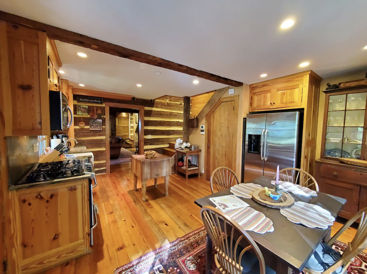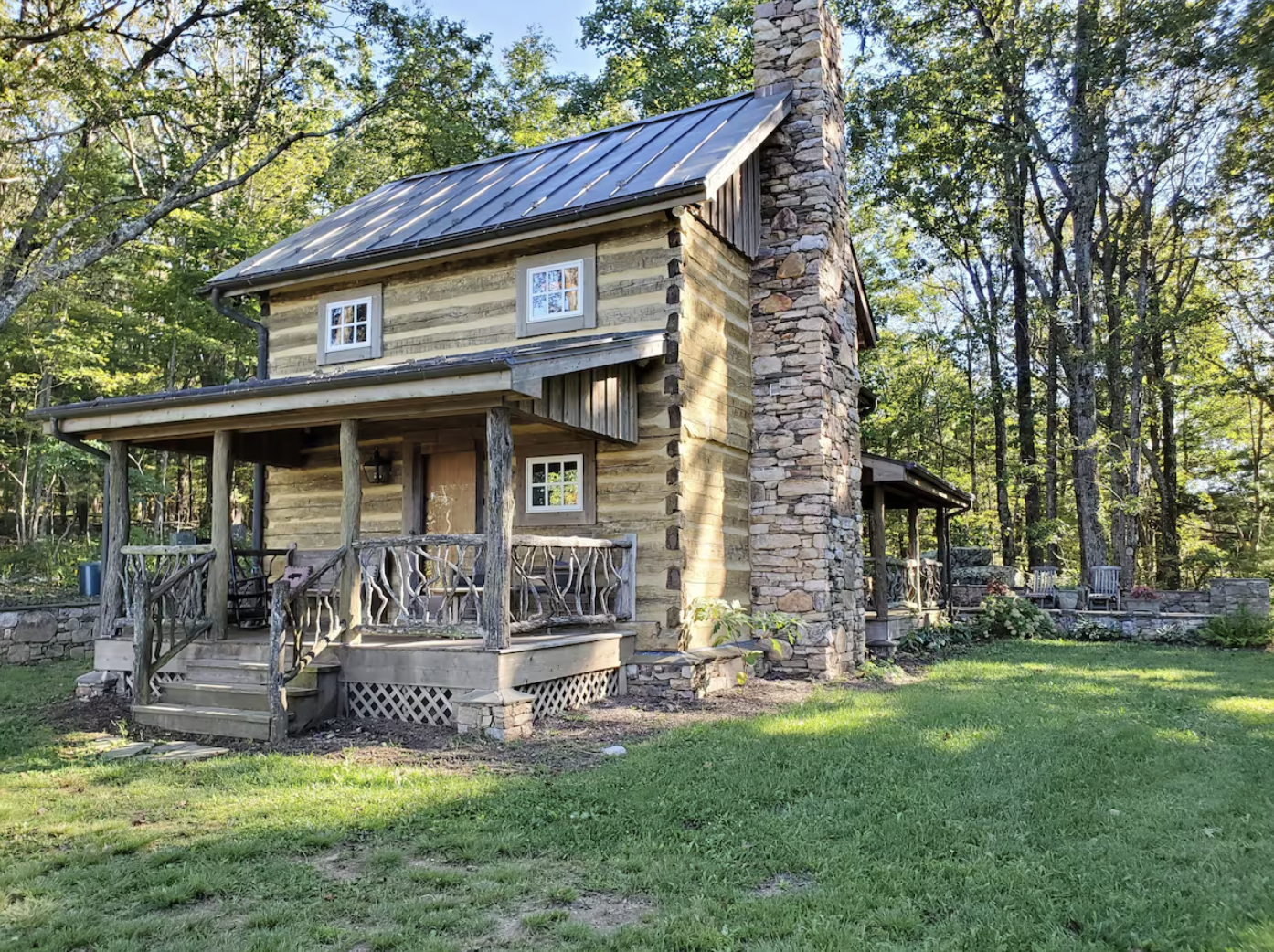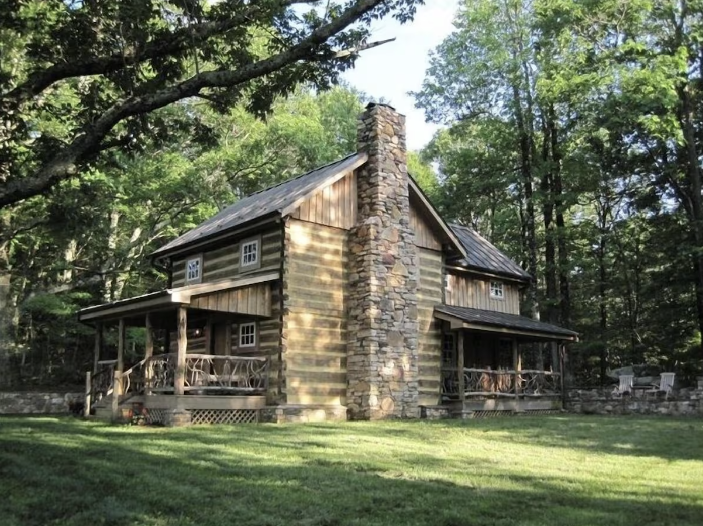 A large covered porch at the front beckons guests to rock in a chair with a cup of something warm and watch the sunrise or sunset over the mountains. Nearby meadows and woods allow for isolation, while the soft murmurs of fauna chirping birds, breezes in the trees, a flowing brook come to the ears. It’s as if the cabin has always existed here, at one with the natural splendor of the Blue Ridge.