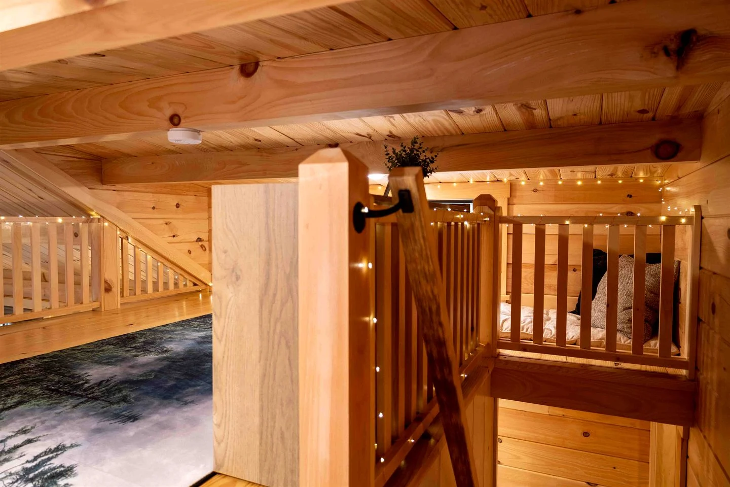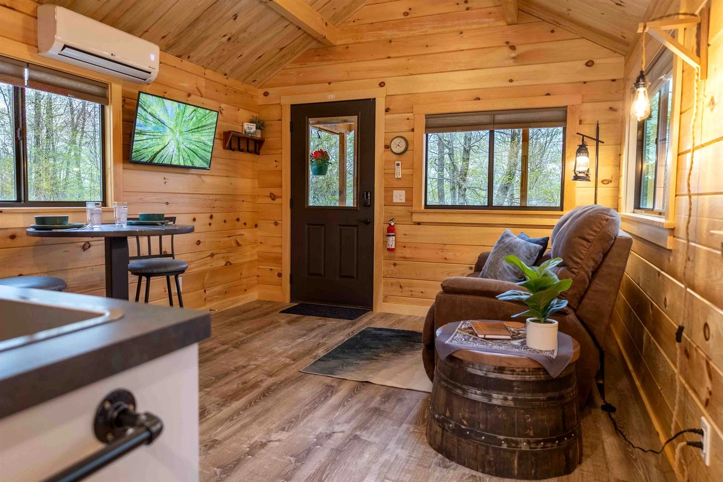 The living area opens up with a recliner loveseat that beckons you to sink in, its cozy lighting casting a soft ambiance across the room. The Smart TV, mounted discreetly, offers a chance to unwind with a favorite show, its screen a gentle contrast to the natural surroundings visible through the windows. The air conditioning and heating keep the space comfortable year-round, the quiet hum a subtle reminder of modern convenience within this rustic shell. This room feels like the heart of the cabin, where the beauty lies in the way it balances relaxation with the call of the outdoors, the loft’s presence adding a playful dimension to the layout.
