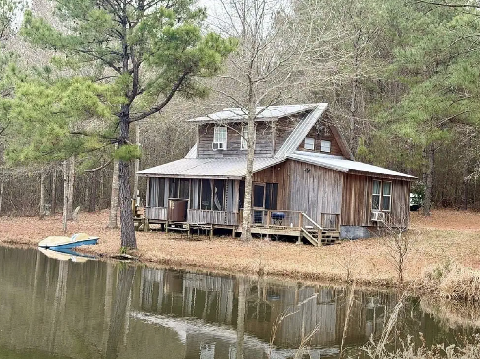 Located in the idyllic historical setting of Ellisville, Mississippi, this charming lakefront cabin marries rustic and natural outdoor living aspects on 18 private acres. This cabin represents a home-away-from-home rather than just another house. Its traditional build brings a timeless charisma making it both comforting and thoroughly relaxing. Being next to a private lake, the cabin and large undisturbed nature made it an unplanned perfect place to enjoy Mississippi’s beautiful nature coupled with the modern conveniences and thoughtful touches.