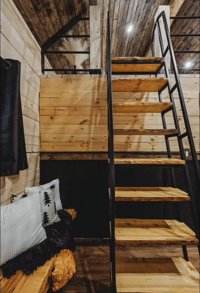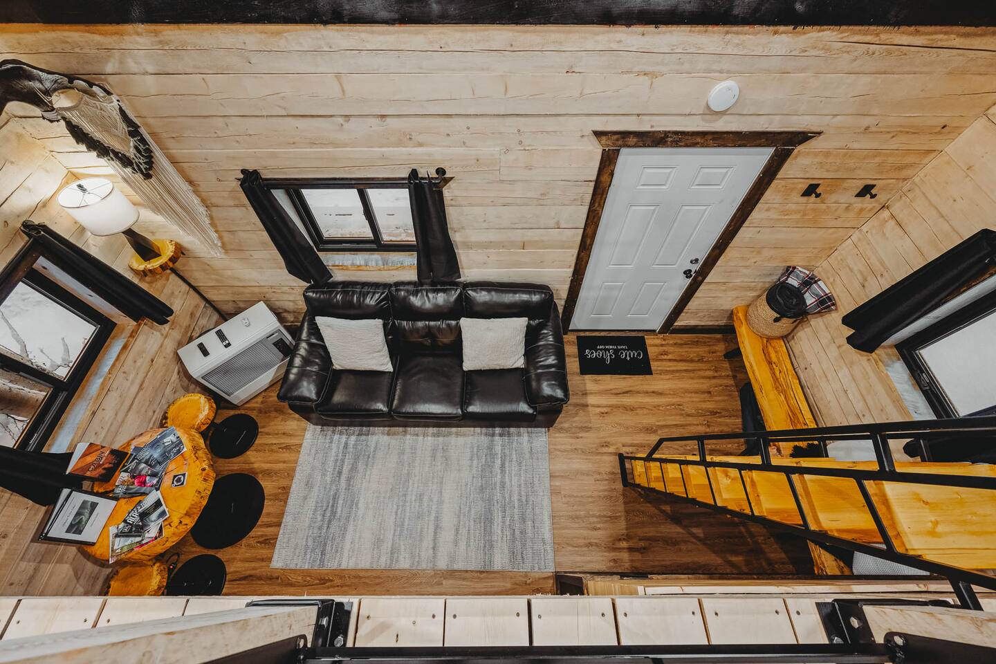 The main living area of the cabin is a warm hug, where the open design turns a small place into a room that feels like it was made for gathering. The living room with a comfortable couch which can be turned into a full-size bed is the spot to relax after a day of adventure, and a flat-screen TV attached to the wall is there for Netflix, Amazon Prime, Disney+, HBO Max, and Hulu users on a rainy day when going out is not an option.