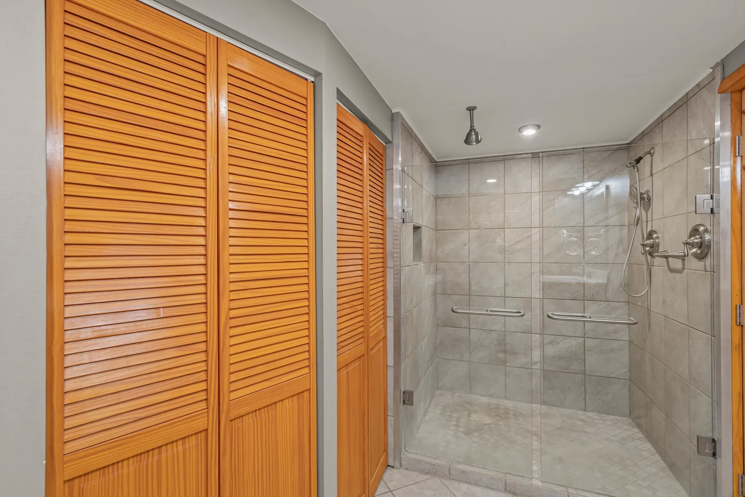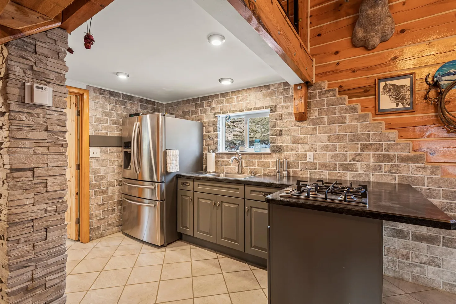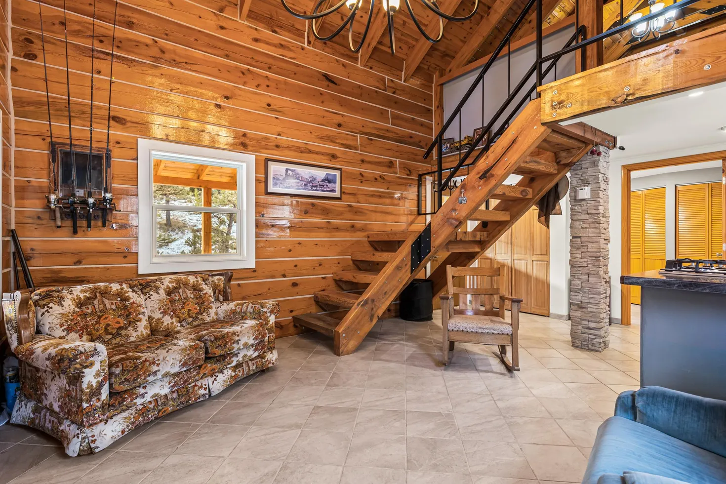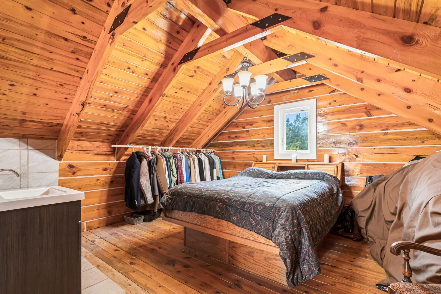 The bedroom is a peaceful resort with a queen bed being side by side with log walls, plenty of closet space for linens and clothes and direct access to a bathroom fitted with modern fixtures and tiled floors.