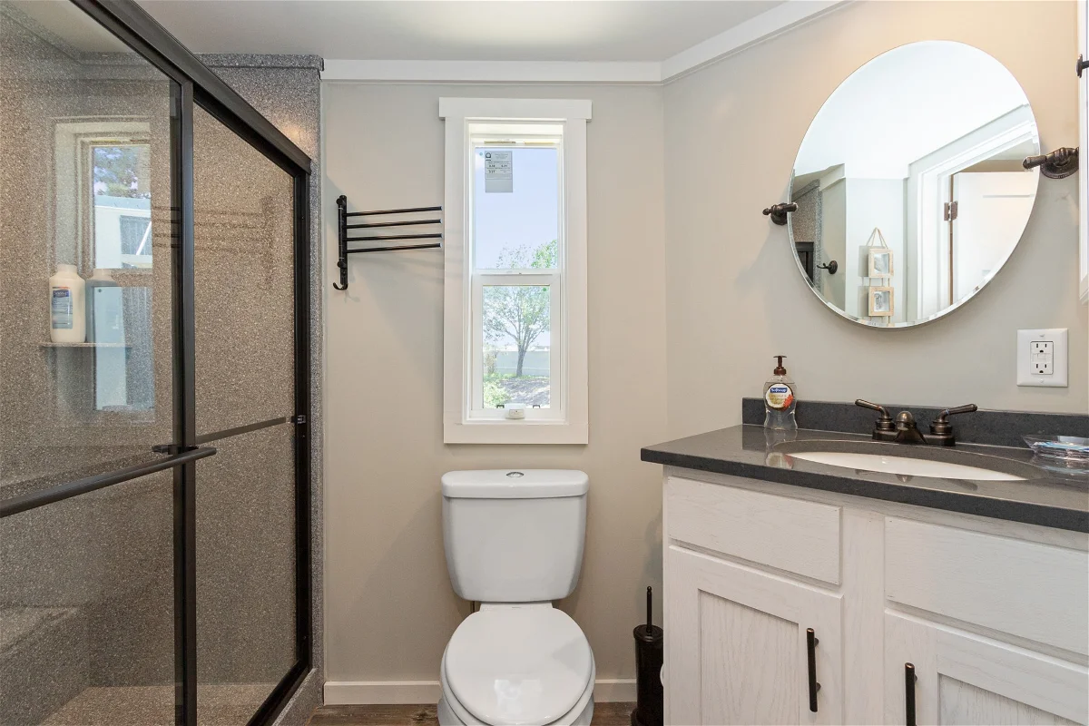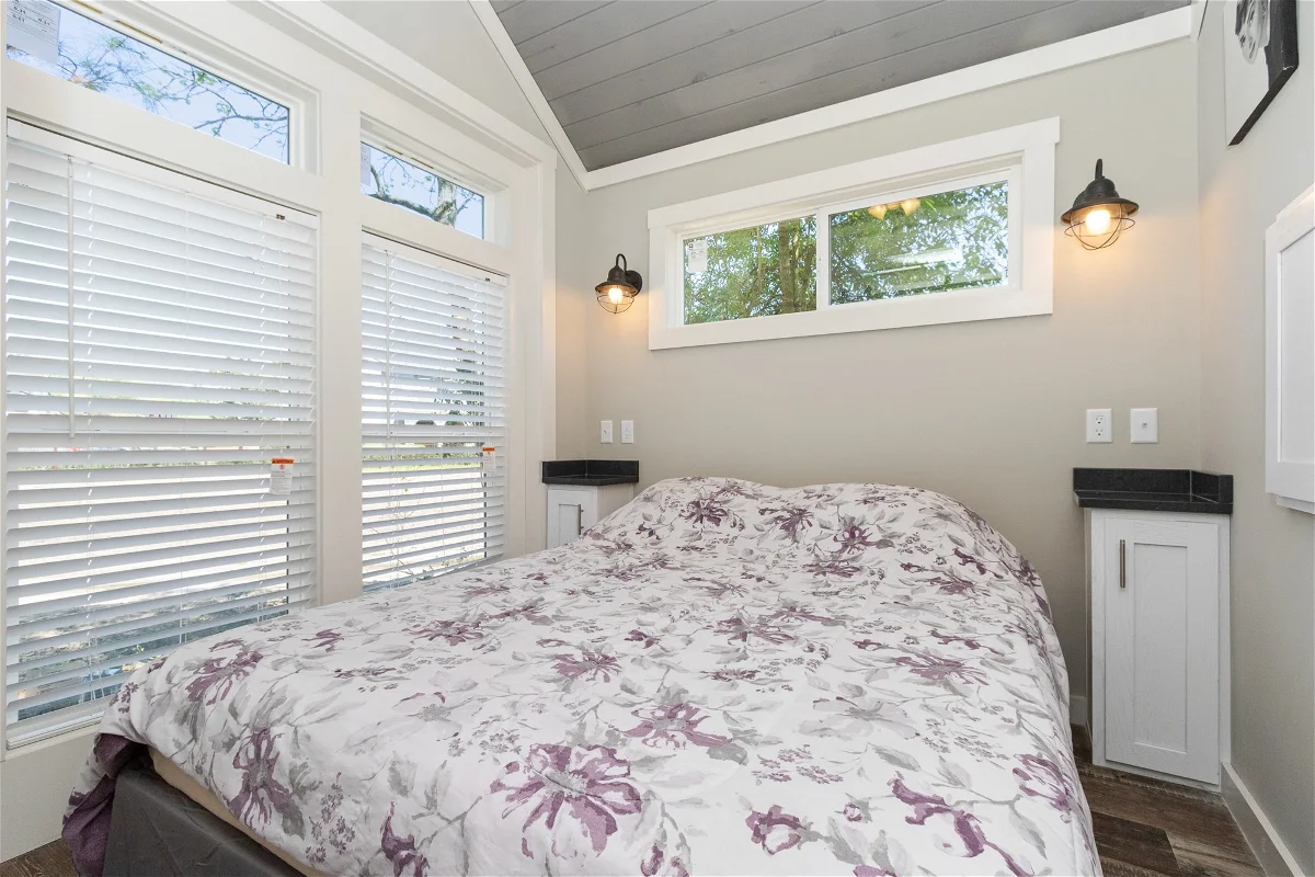 What a perfect retreat the bedroom suite is mellowing the tiny house down with its gentle atmosphere. Sliding barn doors open up to reveal a large room with built-in nightstands, drawer storage, and enough space for a king bed. Soft-close cabinetry and designer lighting feature a boutique hotel atmosphere. The adjoining half bathroom is anchored by an exquisite acrylic shower with modern fixtures—a vessel sink, a contemporary vanity, and a residential-height toilet complete it. Every single thing is pointing to the fact that “this is not your average tiny house”.