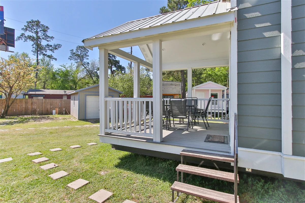The outside of the house looks like a modern piece of art. The neutral-colored Hardie plank siding is very nicely complemented by the paint-wrapped posts and the long front porch with a maintenance-free composite decking. Whether parked at an upscale RV resort, private acreage, or a lakeside community, the clean lines, big windows, and gentle roof pitch give it a lot of charm. This is not a tiny house; this is a destination.
