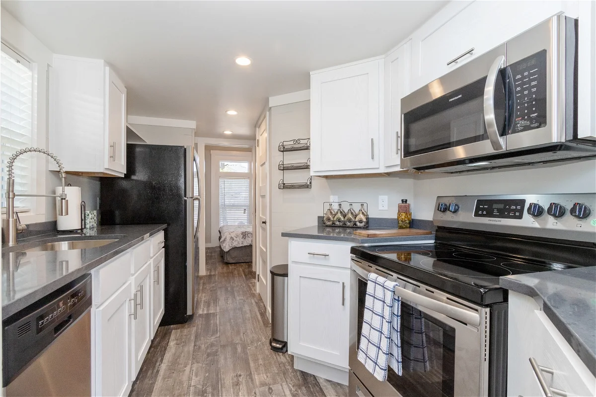 The kitchen is definitely what any chef would dream of regardless of the fact it takes up a small part of the whole house. The shining quartz countertop stretches over the custom cabinets which are combined with stainless-faced appliances that are (both in looks and in performance) as if they were from a full-sized luxury home. A deep sink, full-size refrigerator, and ingenious storage solutions are only what you need to make cooking for two or entertaining for six a real pleasure. Thanks to the open layout, the cook will always be in touch with the people talking and laughing.