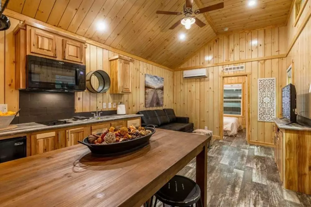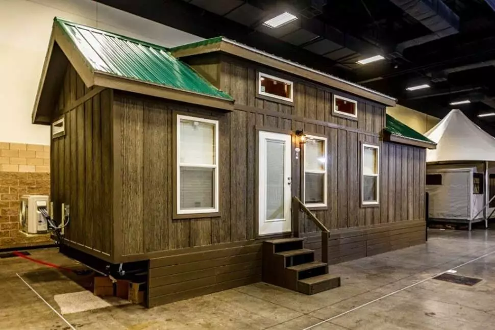 Inside, the open concept unfolds with a warmth that feels hand-hewn, the natural wood interior—perhaps cedar or pine—covering walls and ceilings in a soft, golden glow that makes the space feel alive with the forest’s breath. The living room merges with the kitchen in a seamless flow, the built-ins like shelves or benches adding clever storage that keeps the room uncluttered, the high ceilings lending a sense of loftiness that belies the modest size. The wood’s texture invites touch, the grain a subtle map of the tree’s life, a place where you can sink into a chair with a book and feel the world expand beyond the walls. This layout, with its 399 square feet, creates a spacious feel that’s the model’s quiet triumph, the beauty in how it turns a single room into a heart of the home, where light from the windows dances across the surfaces like sunlight on a mountain stream.
