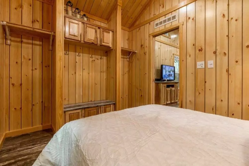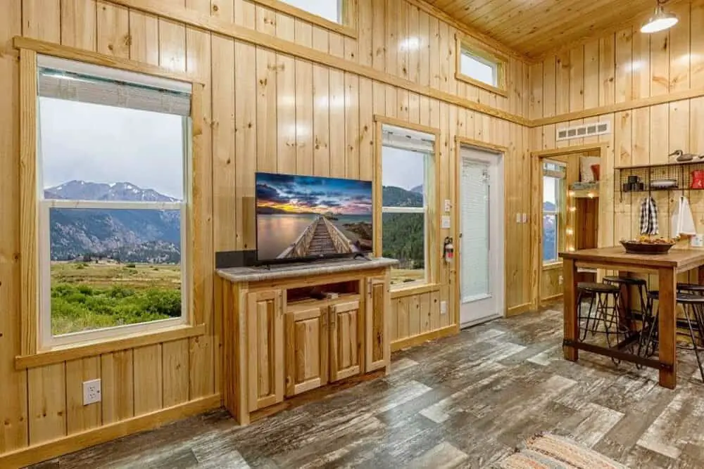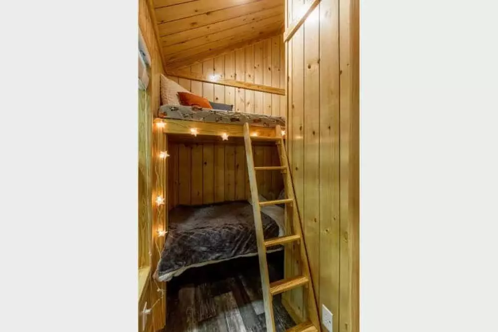 The bedroom, a private wing in this compact design, offers a restful escape, the natural wood walls creating a cocoon-like atmosphere, the space just right for a queen bed and a nightstand with a lamp for late-night reading. The built-ins here might include a wardrobe or shelf, the design keeping it simple yet functional, a spot to end the day with the quiet of the peaks outside. The bathroom, though compact, features a shower and vanity in a layout that’s efficient without feeling rushed, the wood accents tying it to the rest of the home, the natural materials ensuring every moment feels connected to the earth. The beauty is in the restraint, a space that serves without overwhelming, the natural wood a constant companion in the morning light.
