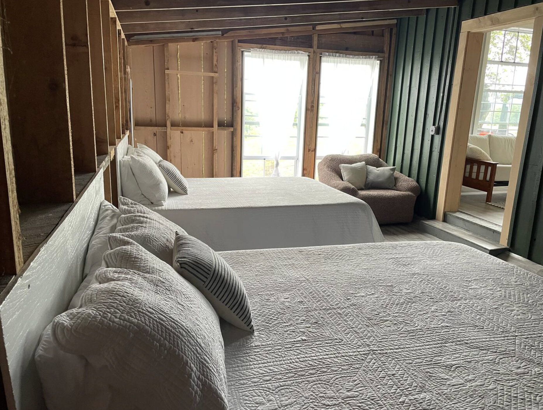 The bedroom, reached by ladder, is like a secret refuge among the clouds above the main space. Beds are comfortable and are fixed under the roof with the windows being up high for the natural light. Due to the height, the space is like a quiet hideaway but is still open visually to the downstairs area. Besides the wind in the trees, the wildlife far off, and the occasional gentle lap of pond water, the loft is a very quiet place to sleep.