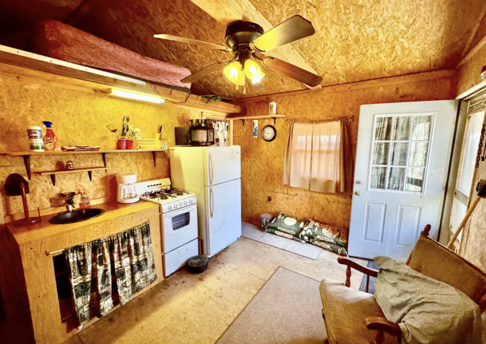The bedroom facilities are comfort level standard. In a bedroom that is up to the mark with a minimalist look, it is always a good idea to have your rest and rejuvenation. By means of a small scale design, the atmosphere that arises is one of loveliness and openness. The bathroom is fully equipped for your daily needs, so you don’t need to be worried about the things you require. The overall setting of the cabin is simple, rustic, and efficient which makes it a perfect place to get away from everything and be off-grid in peace and comfort.