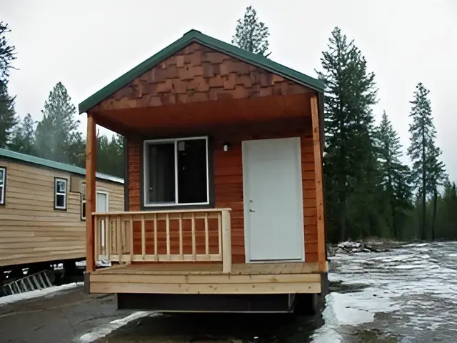 The 5-foot covered porch makes it ideal to stay in different locations since this cabin model is movable.