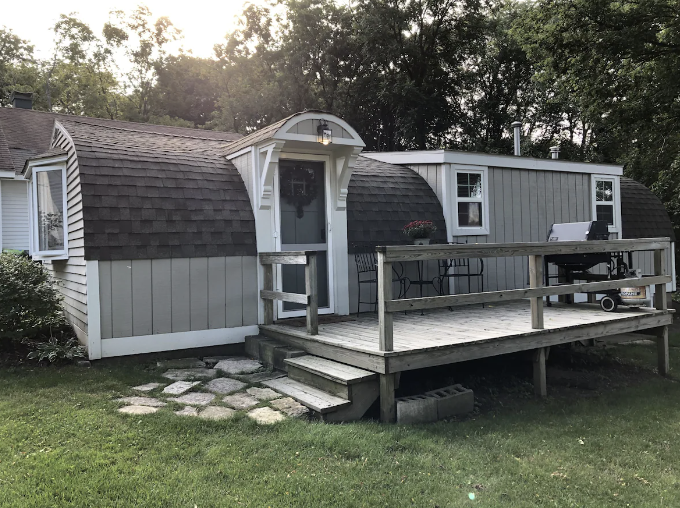Outdoor living is where the Quonset hut home truly comes alive. The porch becomes a favorite spot for morning coffee or evening relaxation, with peaceful views of the surrounding woods. A fire pit invites cozy gatherings, while a charcoal grill offers options for outdoor meals. The Quonset hut home’s location provides complete privacy, only the gentle sounds of the countryside as your companion.