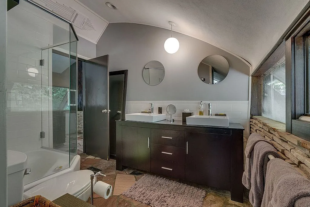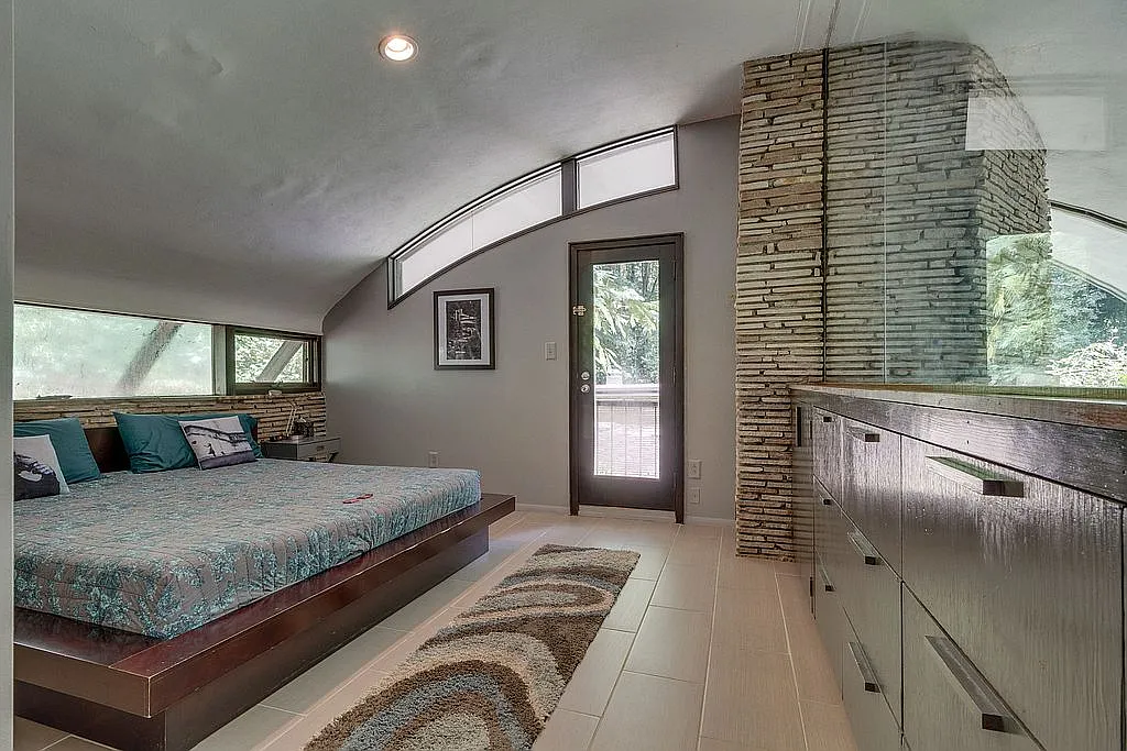 The primary suite in this upmarket Quonset hut is a magnificent piece of work. For the maximum seclusion, it is situated on the upper floor and it comes with a bathroom reminiscent of the spa kind with dual sinks, a free-standing soak tub located right under the curved ceiling, and a large walk-in shower with the water coming from a rainfall fixture.