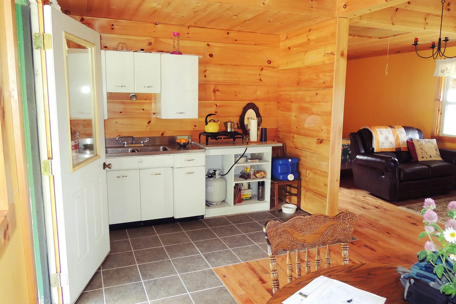The bedroom is a tranquil refuge, a queen bed is placed against the log walls, lots of closet space is there for linens and clothes, and direct access is provided to the full bathroom which is fitted with the latest fixtures and has tile floors. The bunk room, a lovely idea perfect for guests or kids, provides twin beds stacked with space for a dresser, the room being comfortable and useful for a family vacation.