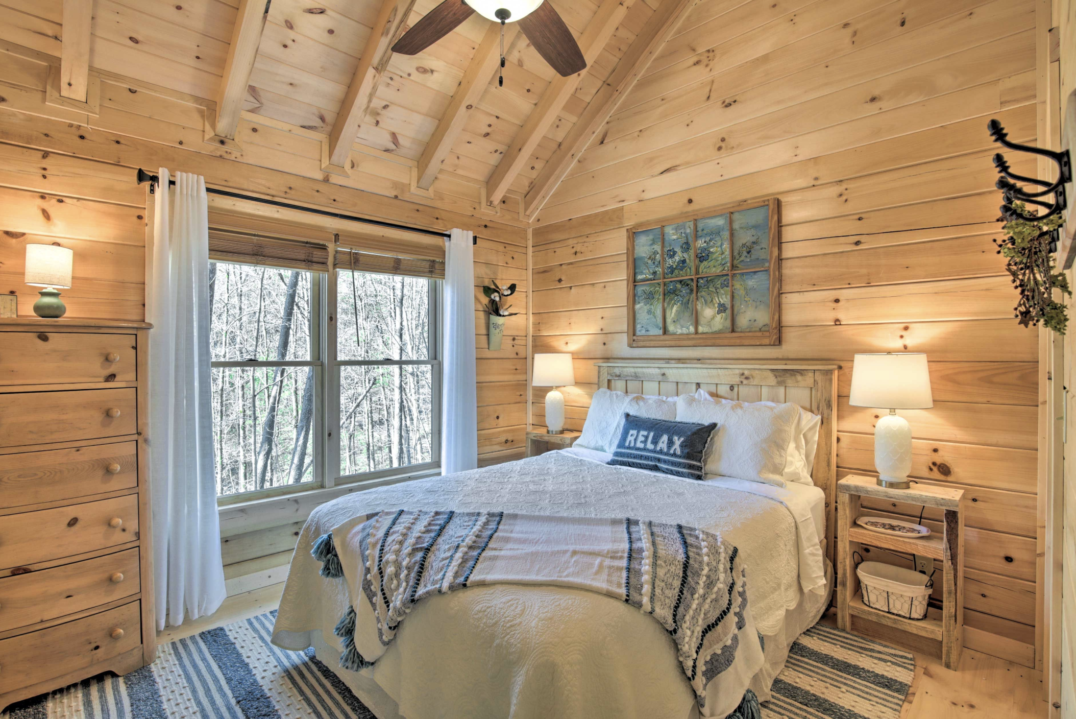 From the bath area, you can see that the owners have taken good care of the guest’s needs without going overboard, and the finishings are in harmony with the cabin setting.