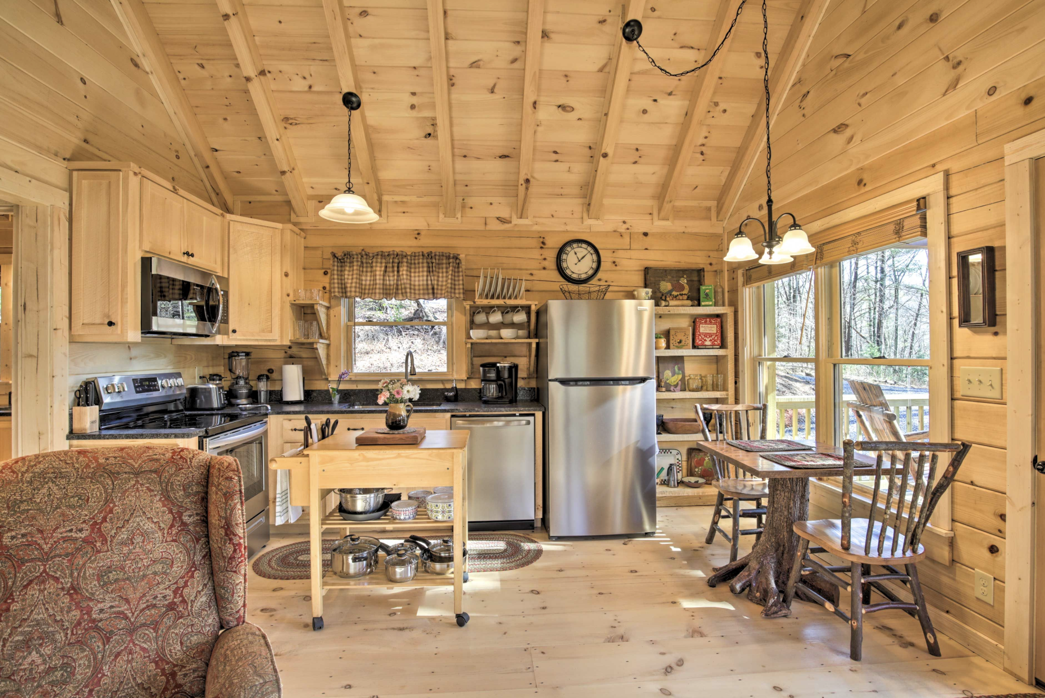 Upon entering, you are immediately wrapped in the comforting warmth of the cabin. The open living area is tastefully furnished with cozy sofas that are great for gathering or for quiet evenings. A traditional fireplace is the focal point and it will not only provide you with the warmth but also the ambiance of the evenings. The sunshine that streams through the windows accentuates the natural wood colors and makes the room very inviting and pleasant. This room is perfect for recreation and relaxation, after a day out exploring the local trails or simply soaking in the serenity of the mountains.