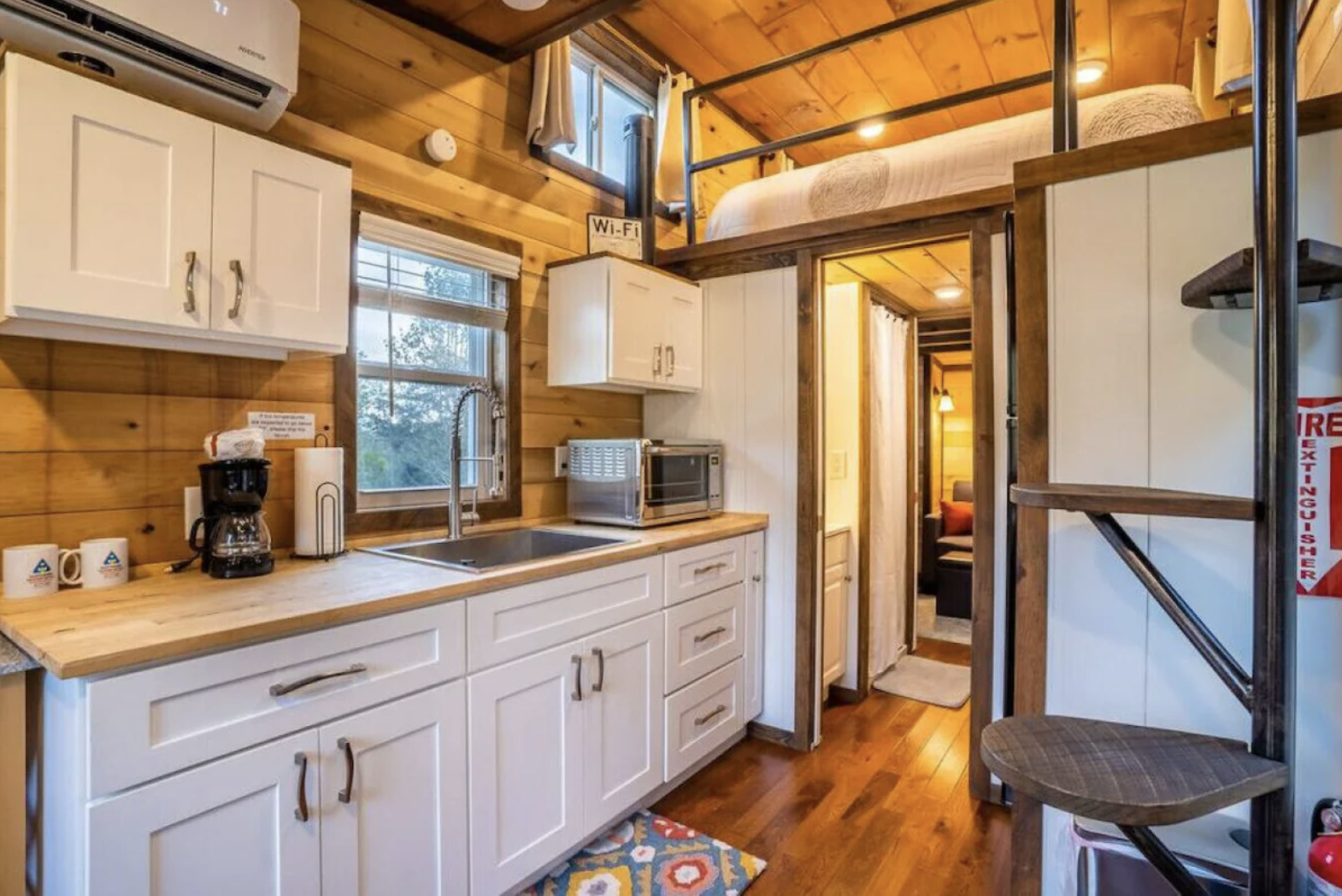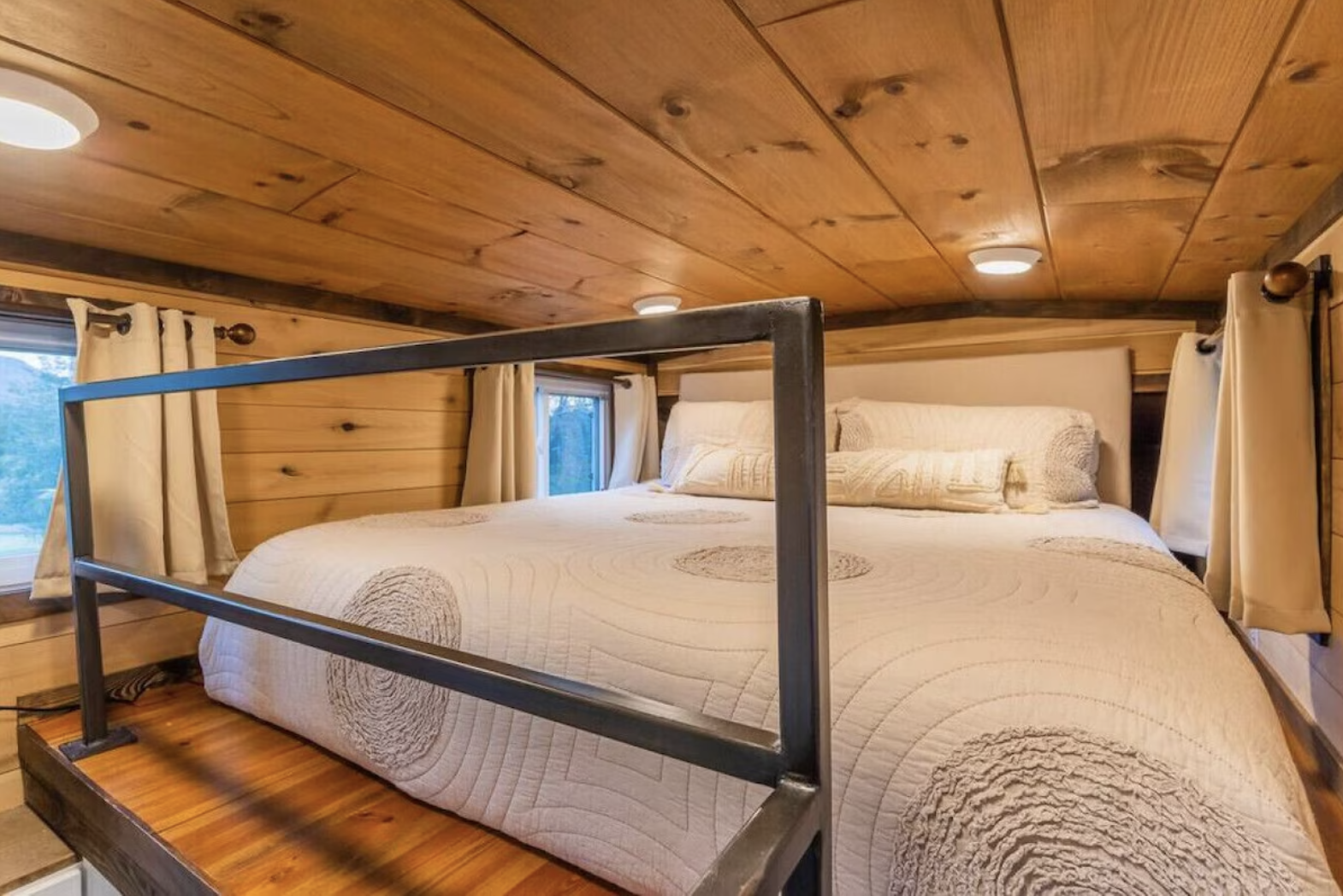 Do not be fooled by the exterior; Step inside and the tiny home will astonish you. The home benefits from high ceilings and large windows that give it an open, bright feel, while the clever design takes care of the tight space issue. The living space of the open-plan home is the perfect setting for the dream kitchen which has the latest stainless appliances, a full-size refrigerator, hob, microwave, and counters galore. Breakfast in a hurry or a romantic dinner? Go ahead, you have all the necessities here—plus the mountain view that even makes washing easy.