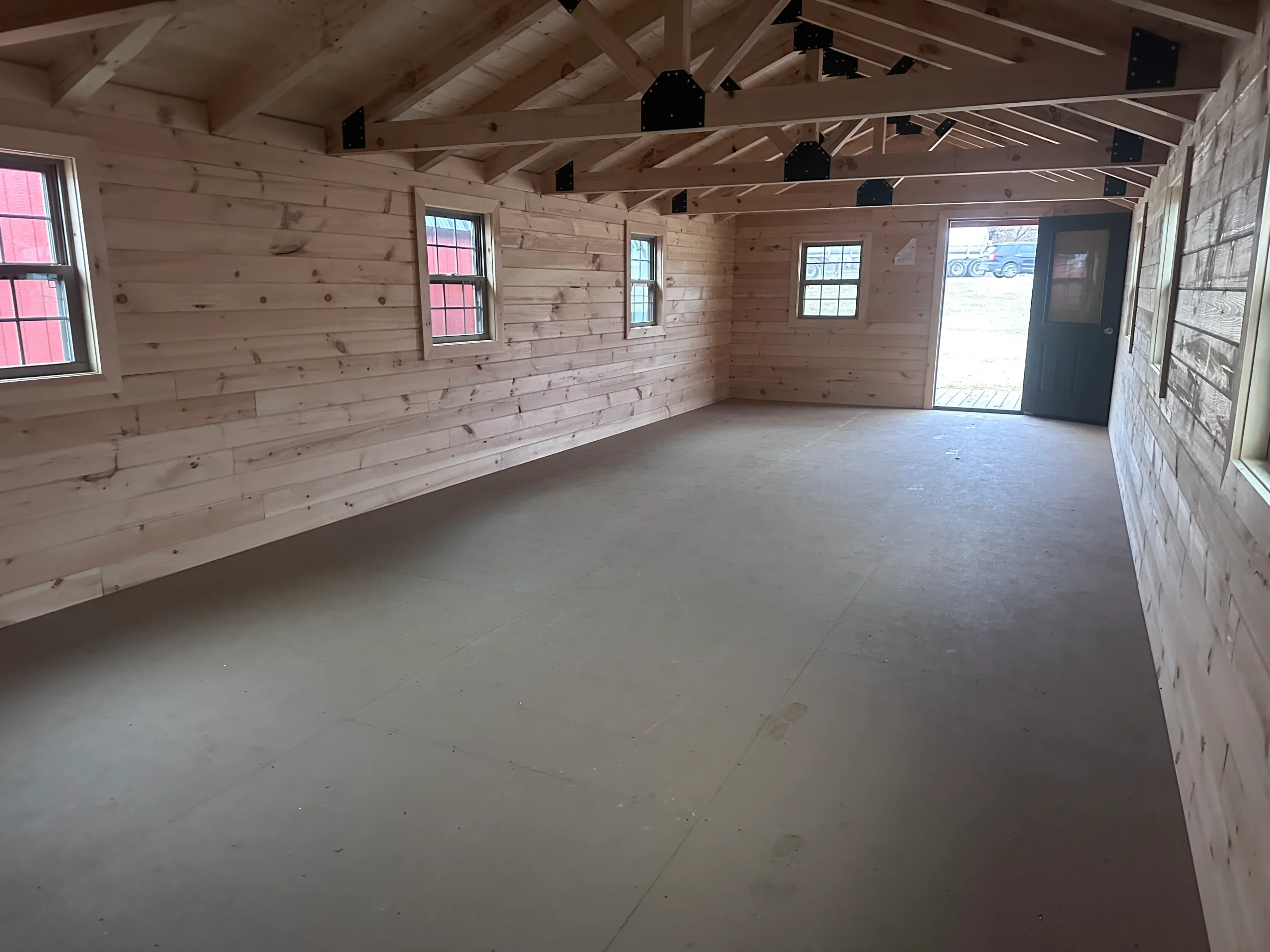 Taking a look inside reveals a raw yet promising interior, the tongue-and-groove flooring and walls offering a smooth base of natural wood, the 2″ spray foam insulation in the floors and 1″ foam board in the ceiling ensuring a cozy climate. The timber trusses, exposed and robust, create a high ceiling that lifts the spirit, the unfinished state leaving room to install drywall, paint, or paneling as desired. This openness allows for a bedroom, a living area, or even a small workshop, the windows casting a soft glow across the space. The lack of finished fixtures means the cabin awaits your vision—perhaps a kitchen with a sink, a bathroom with a shower—but the bones are solid, a testament to Catskill Sheds’ craftsmanship, ready to be shaped into a home.