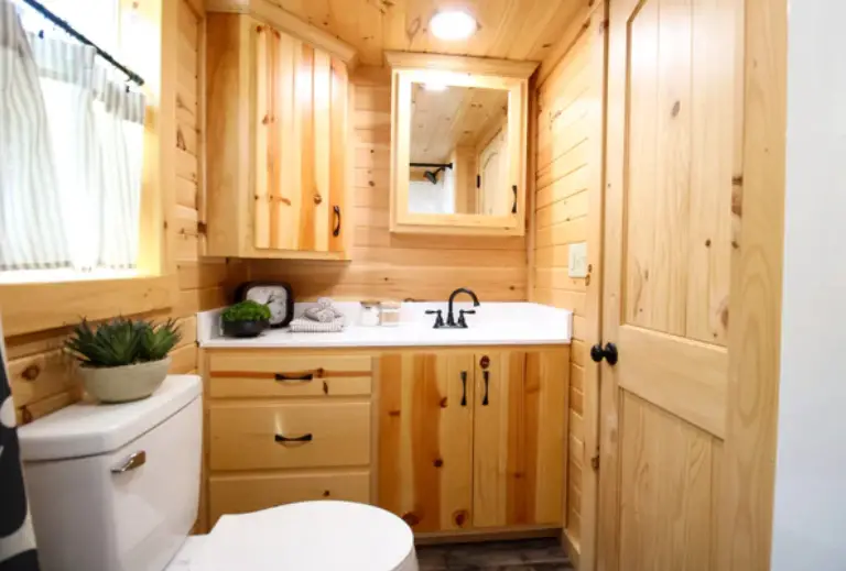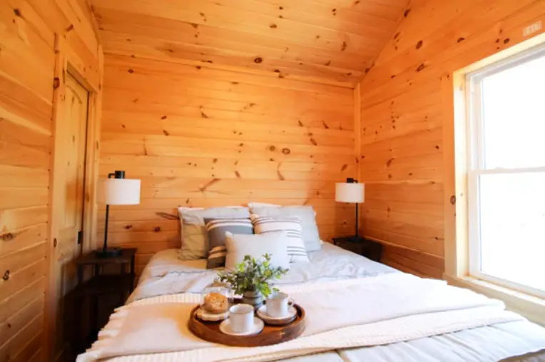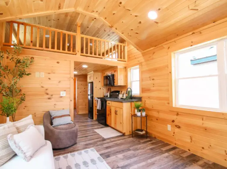 The interior invites a personal journey, turning the 400 square feet into a custom retreat. The living room/kitchen combo could be furnished with a sofa and table for $500-$800, creating a gathering spot, while the bedroom might gain a nightstand or dresser for $300-$500. The loft could be fitted with a mattress or shelves for $200-$400, and the porch with chairs for $150-$250. The bathroom’s pine vanity and shower offer a starting point for upgrades like a mirror or towel rack, costing $100-$300. This hands-on process shapes a space—whether a quiet haven, a guest suite, or a creative studio—reflecting effort and imagination, with the $115,000 price from Amish Built Cabins reflecting a solid foundation for a home built with care.