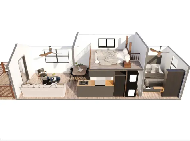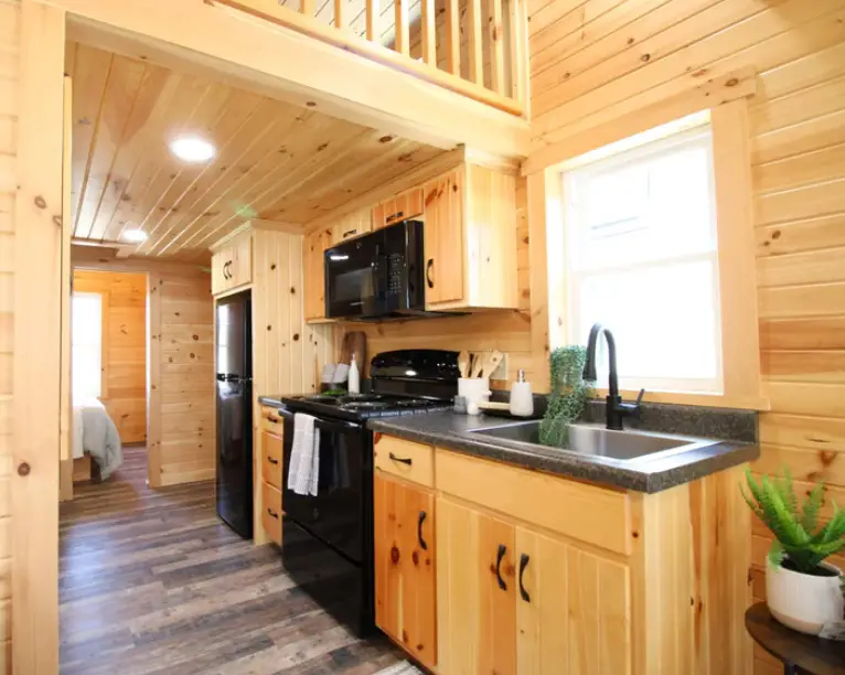 Stepping inside, the living room and kitchen combo unfolds with an open warmth that feels both functional and inviting. The bright space, accented by a ceiling fan for gentle circulation, serves as the heart of the home, its layout encouraging movement between cooking and relaxing. The kitchen, equipped with a cookstove, refrigerator, and microwave, becomes a practical hub, the countertops offering ample room for meal preparation or casual gatherings. The pine vanity in the bathroom adds a touch of rustic elegance, its wood tones complementing the shower and toilet, while the bedroom, with its ceiling fan, bedframe with storage, and closet, offers a serene escape. The loft, accessible by stairs, provides a cozy area for kids or extra storage, its placement enhancing the cabin’s efficient use of space.