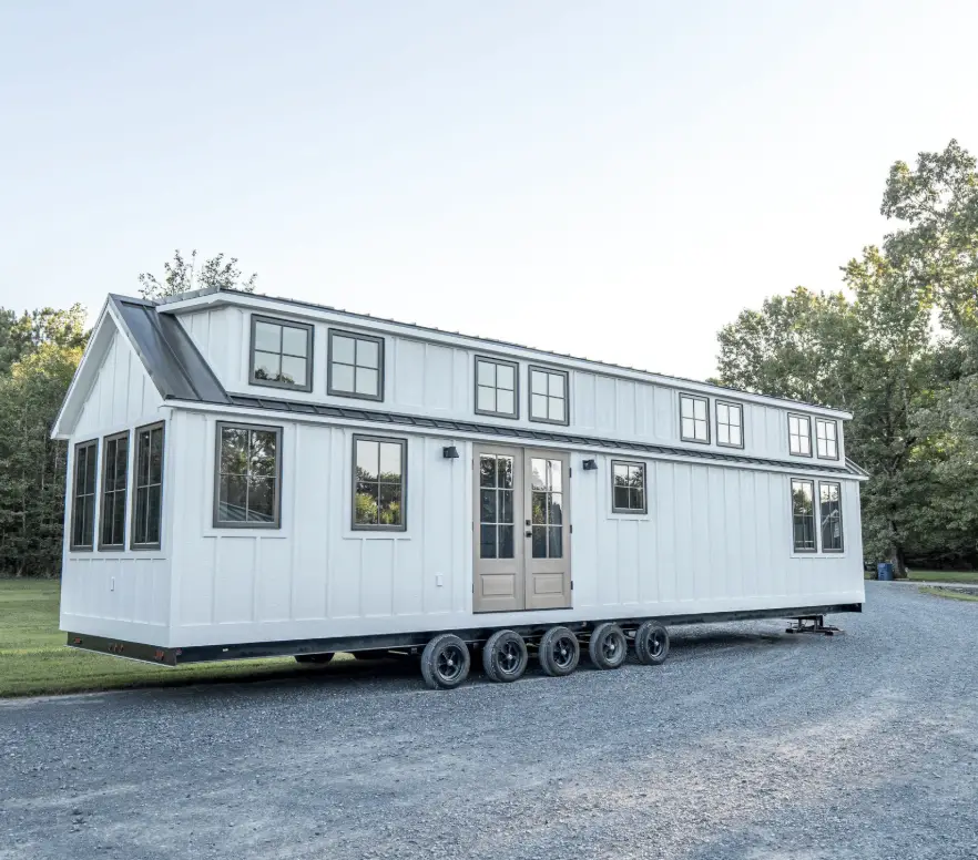Picture it rolling up, its trailer base humming with the promise of adventure, the 41′-4″ length a gentle giant on the highway, the 9′-8″ width snug yet sturdy. The exterior, likely clad in warm wood tones, catches the light with a rustic glow, the 13′-10″ height giving it a roomy feel that surprises you as you step inside. I can see it parked by a riverbank, the wheels stilled, the home sinking into the earth like it’s always belonged, or towed to a family reunion site, ready to host. The windows, scattered like eyes across its face, let in the world, and the sloping roofline offers shelter with a quiet elegance. It’s a design that Timbercraft Tiny Homes has perfected, a rolling treasure whose beauty lies in its ability to fit any landscape, a companion for wherever life takes you.