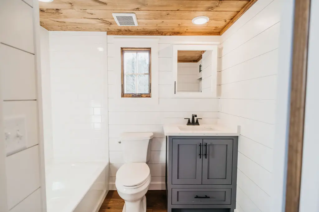Walking in, the living room (9′-1″ x 8′-4″) wraps you in a cozy embrace, its compact space just big enough for a loveseat and a laugh, the windows pouring in sunlight that dances on the walls. Next door, the kitchen (9′-1″ x 10′-8″) unfolds with a U-shaped grace, the counters holding a stove and sink where you might whip up a meal, the cabinets a haven for spices and stories. That little pantry and linen closet—rare gems in a tiny home—add a touch of order, a spot to stash extras that makes off-grid living feel like a breeze. It’s a flow that feels natural, the beauty in its unhurried rhythm, a place where cooking or chatting becomes a moment to savor.